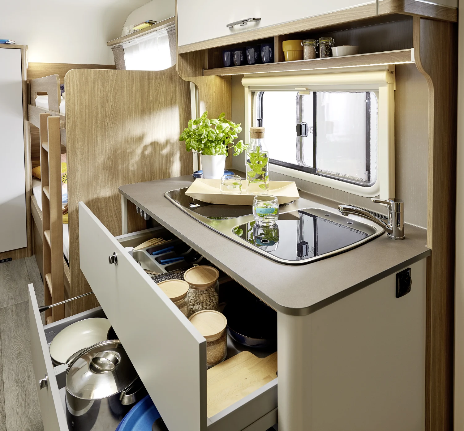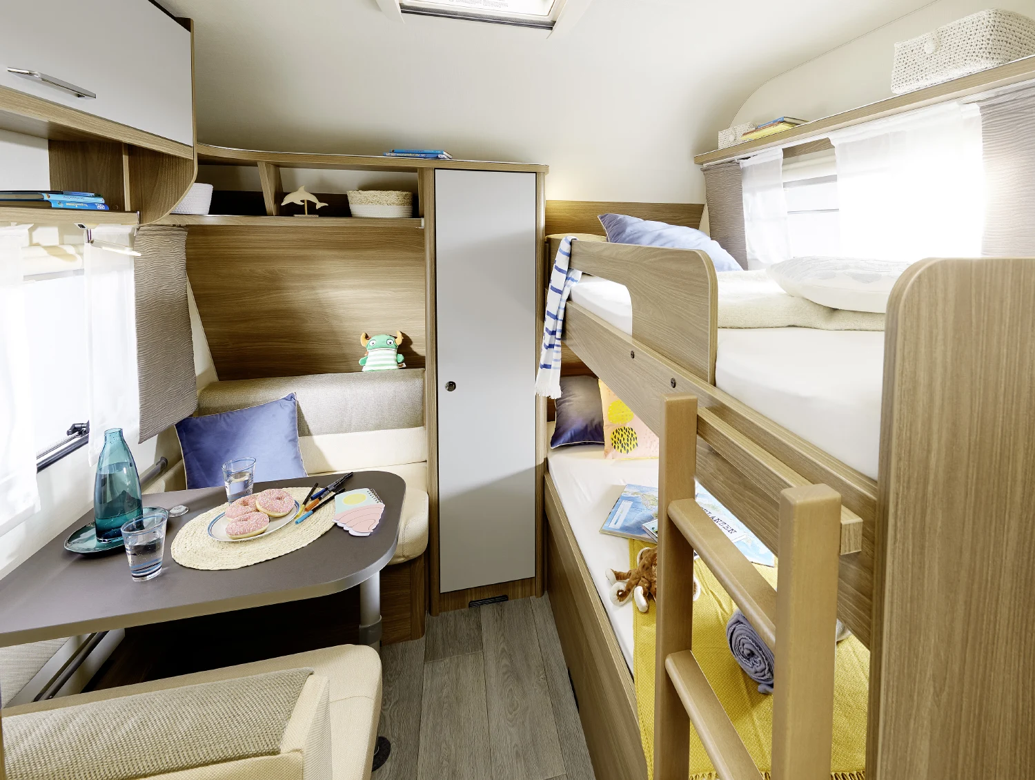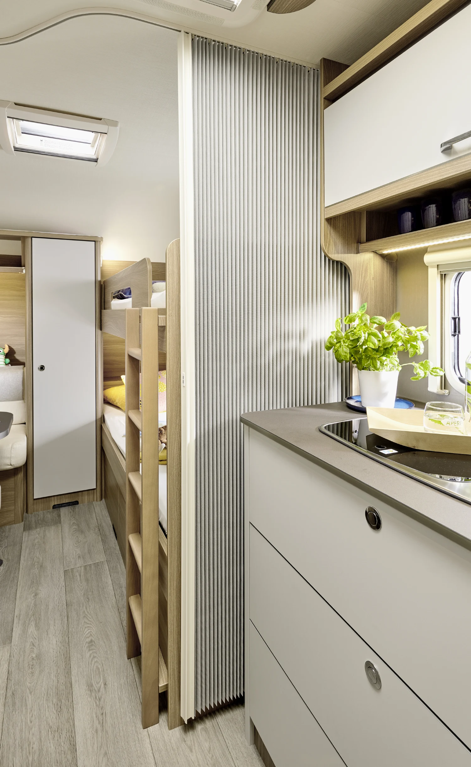 • strefa z łóżkiem piętrowym i miejscem do przechowywania, dodatkowo z siedzeniami i stolikiem, pełniąca rolę oddzielnego pokoju dziecięcego (w wybranych modelach)