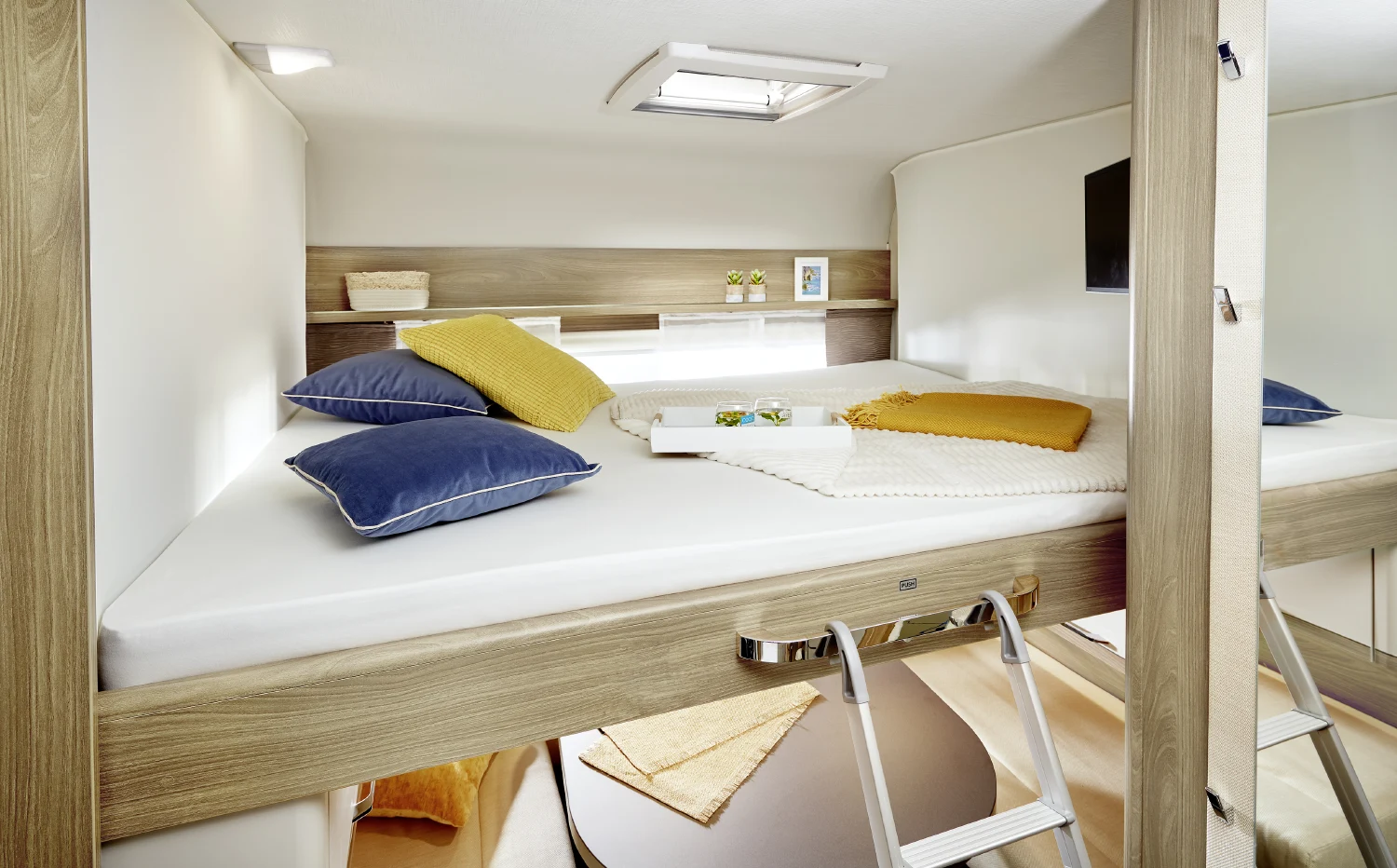 • stałe łóżka podwójne, pojedyncze lub piętrowe, duże łóżko opuszczane nad częścią wypoczynkową, materace z zimnej pianki idealnie dopasowujące się do ułożenia ciała