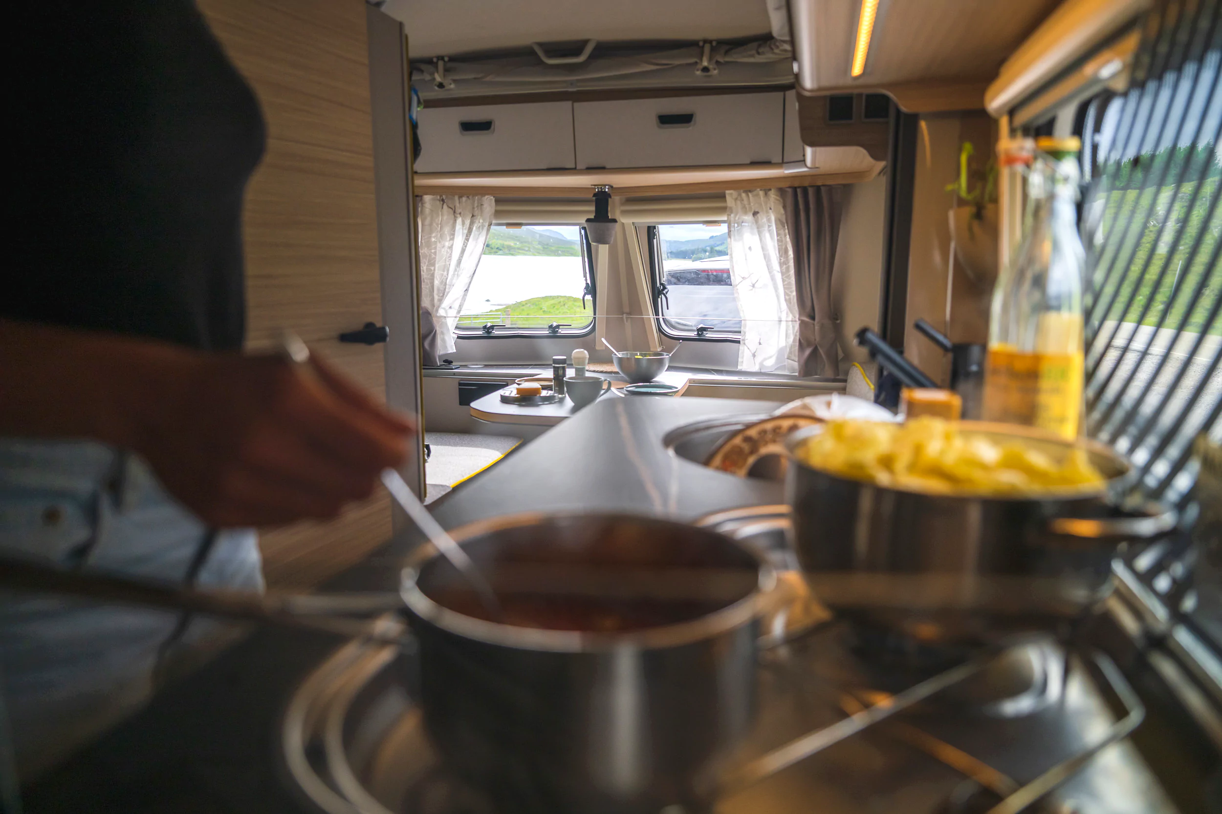 - wygodny aneks kuchenny ze zlewozmywakiem, 2-palnikową płytą grzewczą, lodówką i praktycznymi szafkami do przechowywania przyborów kuchennych