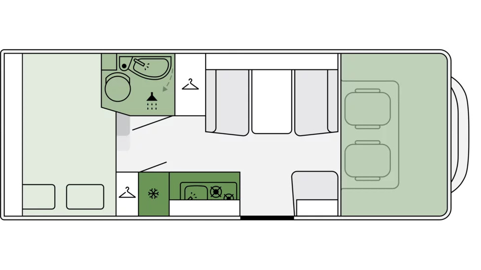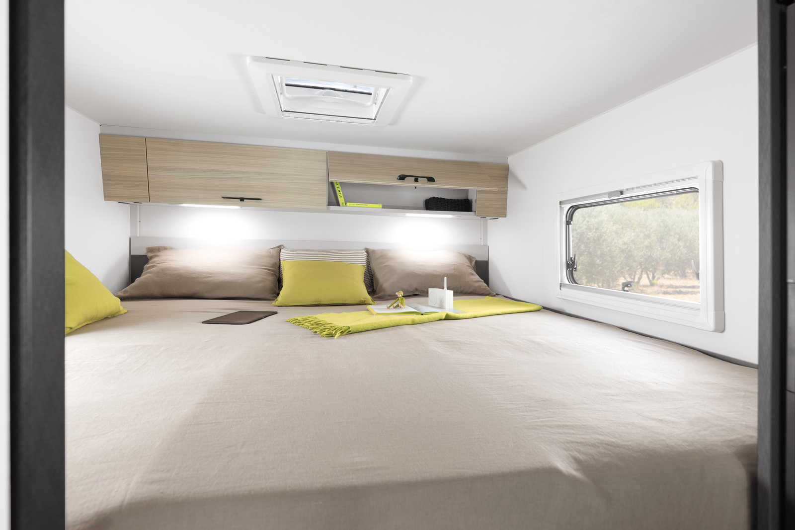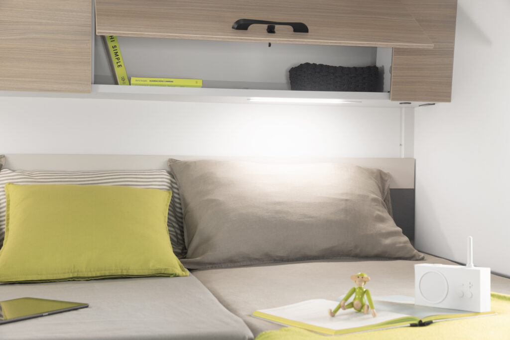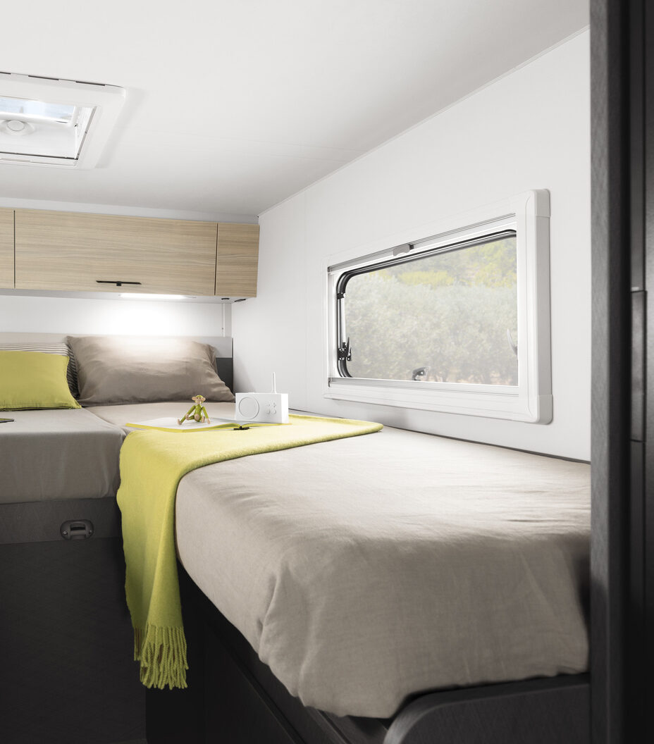 - Stałe łóżko w alkowie z bocznym oknem i siatką zabezpieczającą dla najmłodszych pasażerów.