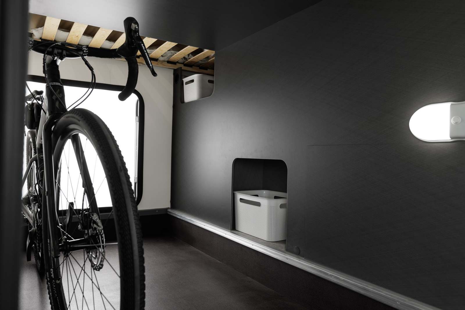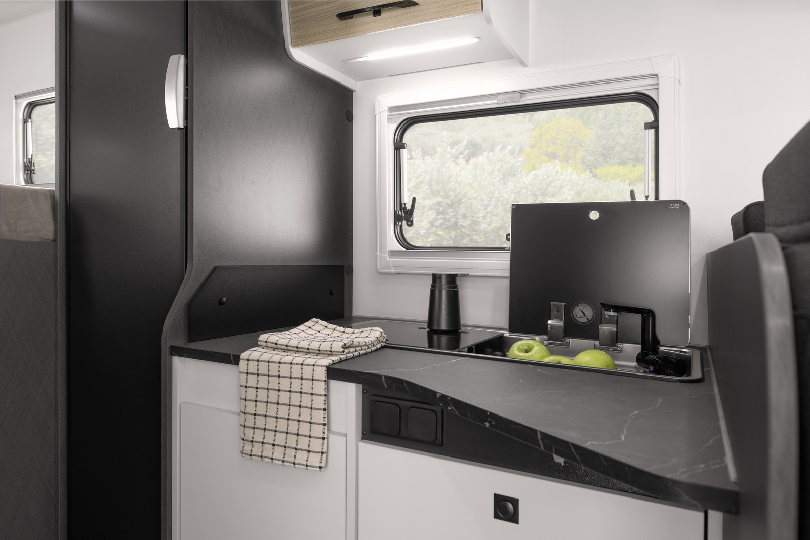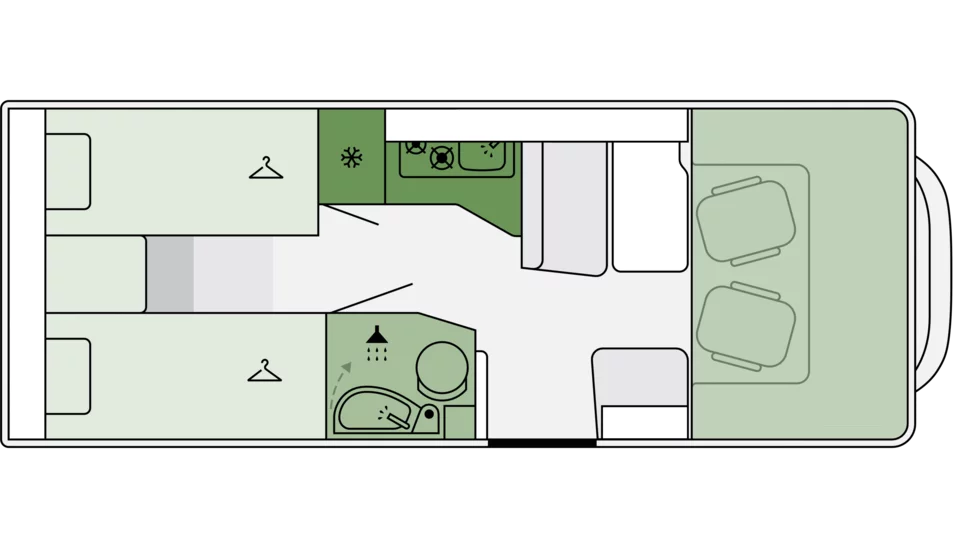 - Stałe łóżko w alkowie z bocznym oknem i siatką zabezpieczającą dla najmłodszych pasażerów.