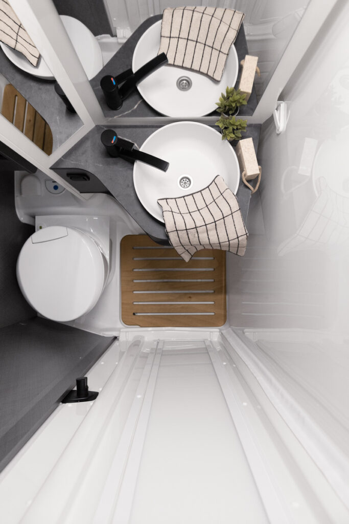 - Toaleta kasetowa z obrotową muszlą dla maksymalnego wykorzystania dostępnego miejsca.