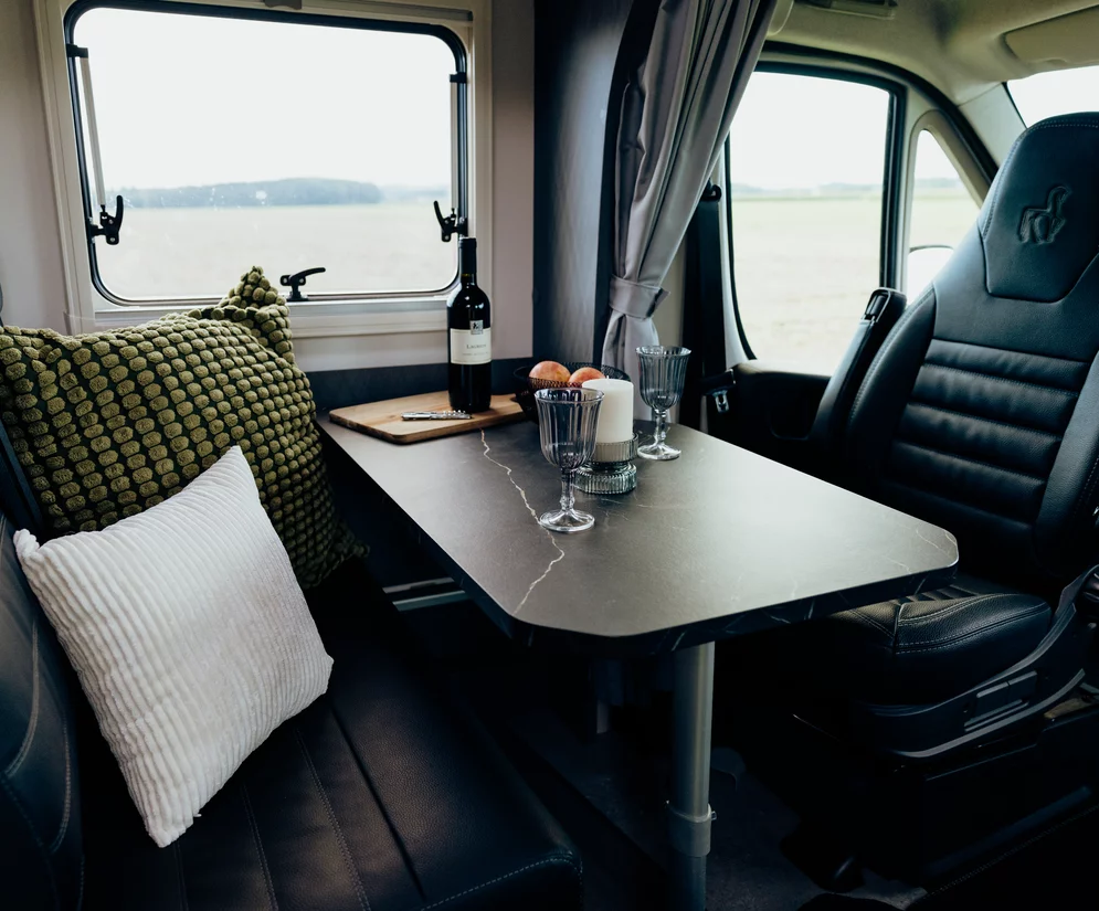 - Przesuwny stół ułatwiający zajmowanie miejsc przy obrotowych fotelach szoferki.