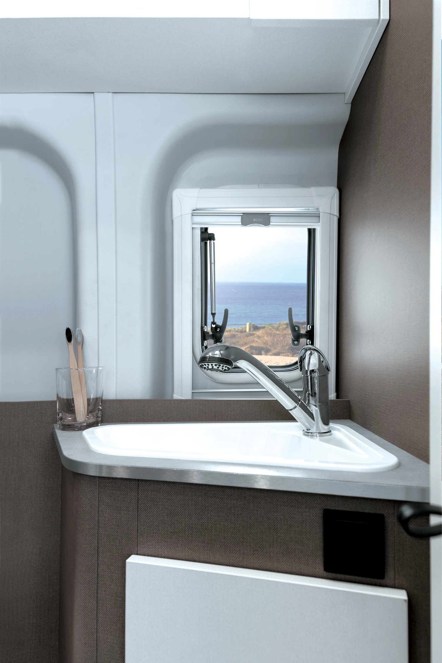 • okna z podwójnymi szybami, wyposażone w moskitiery i rolety zaciemniające, duże okno dachowe lub panoramiczne nad kabiną kierowcy