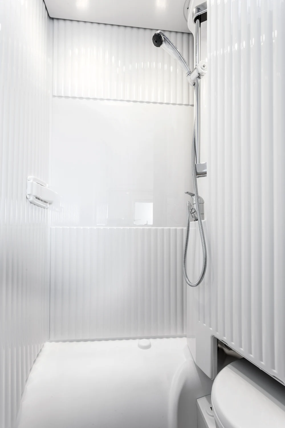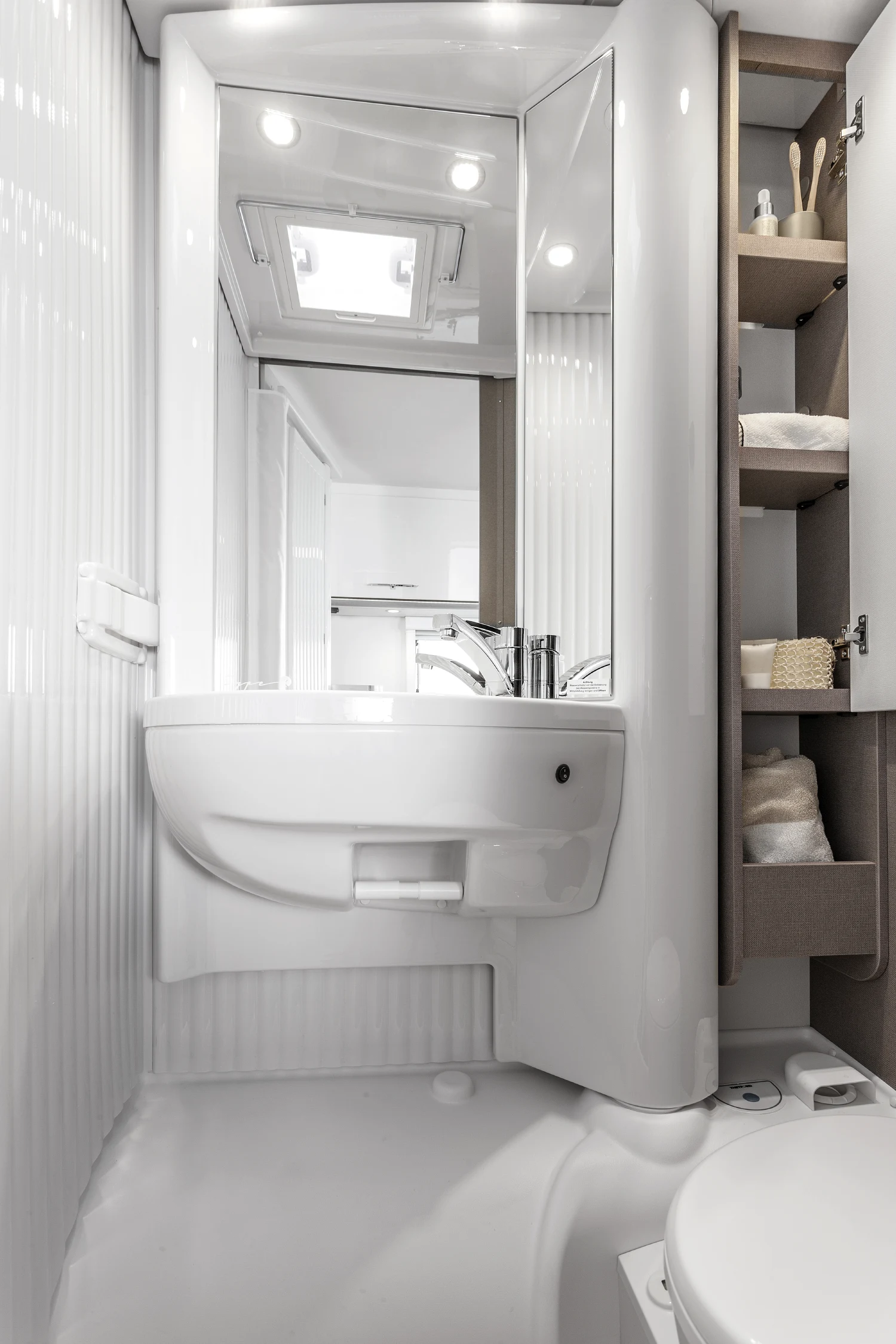 - łazienka wyposażona w toaletę kasetową, umywalkę oraz szafki, prysznic z wysuwaną ścianką