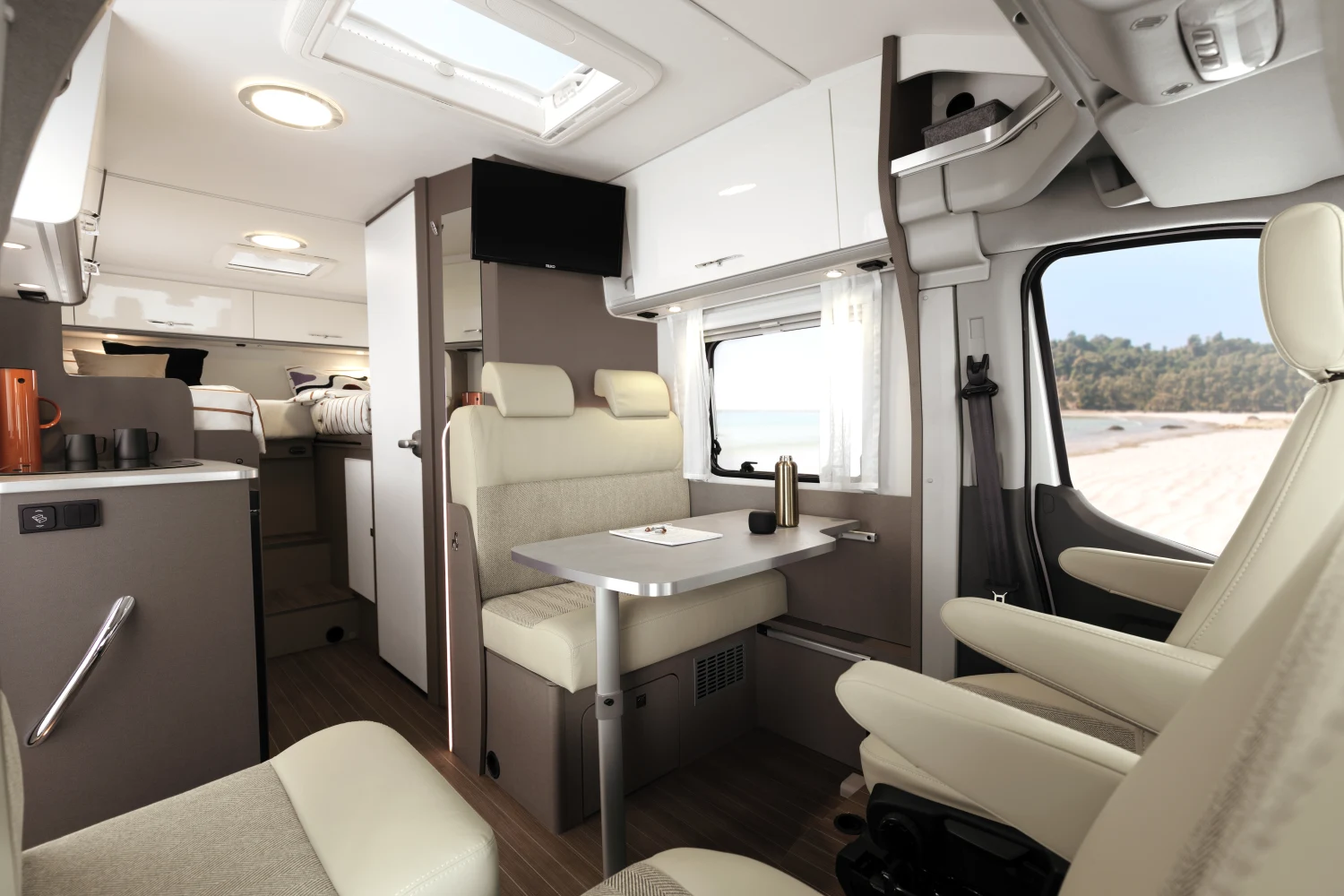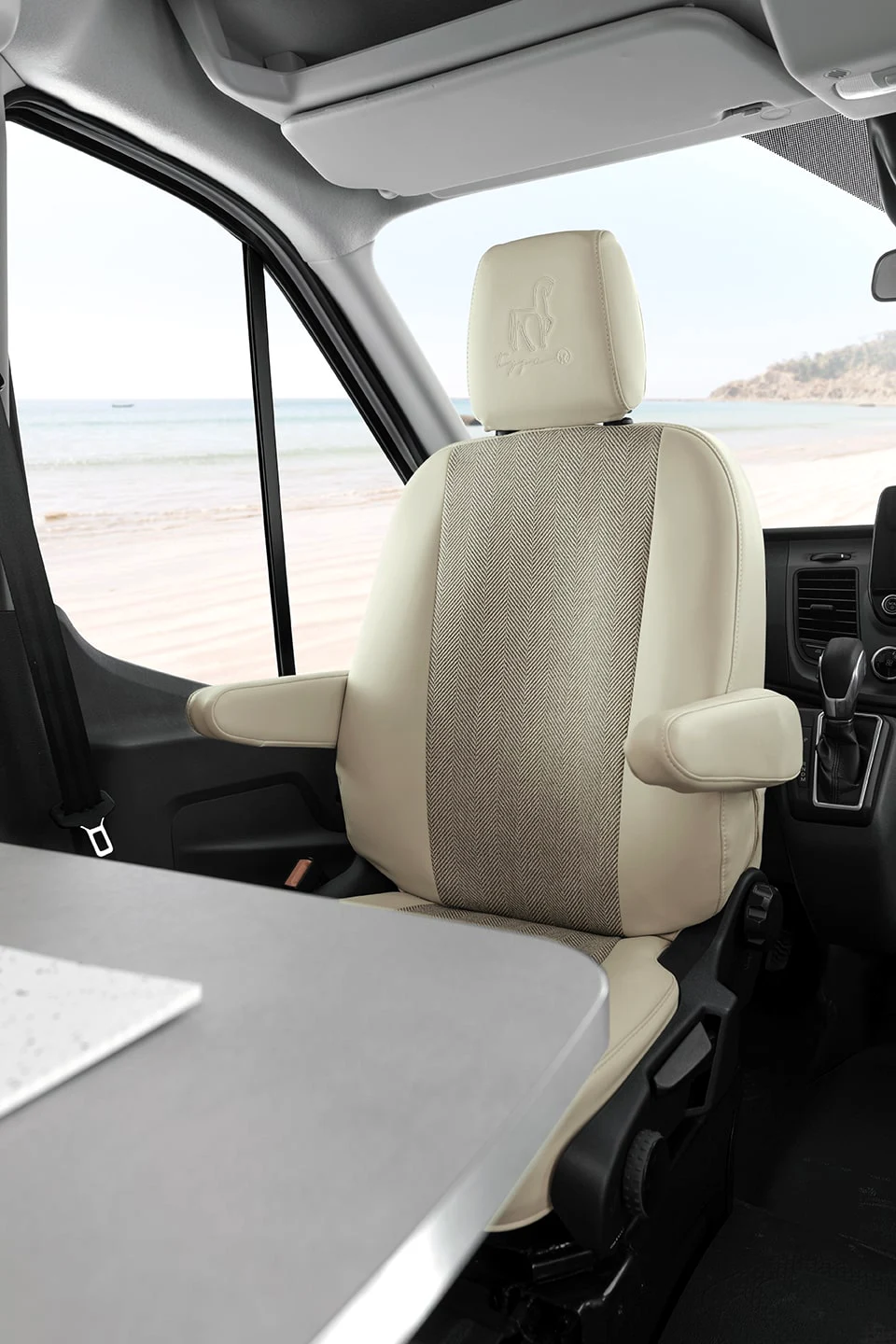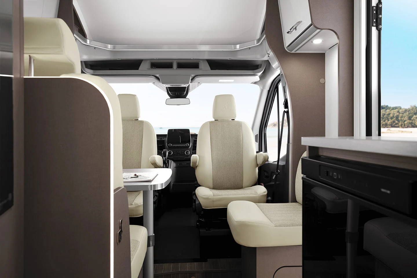 - ergonomiczne siedzenia z zagłówkami i stół w części jadalnej