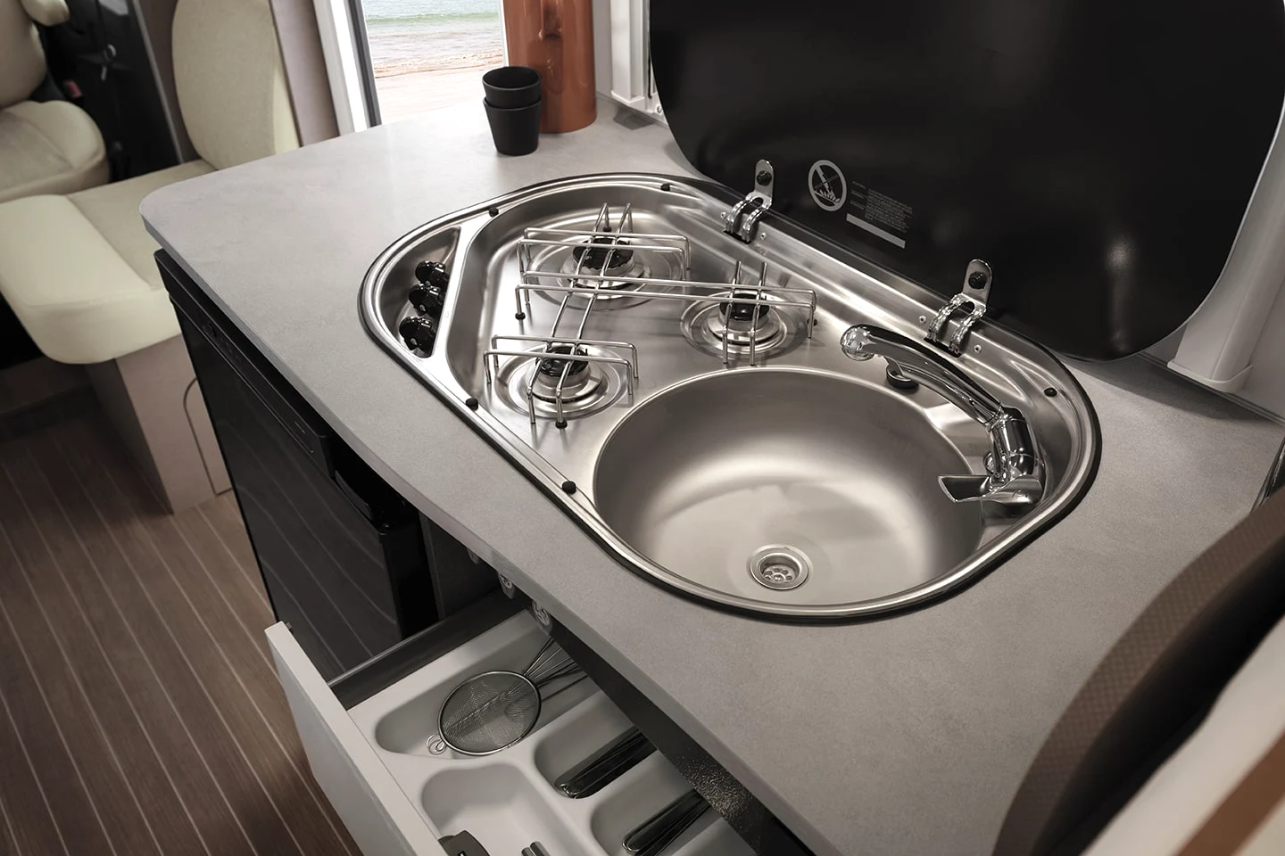 - aneks kuchenny z praktycznymi szafkami i wygodnym blatem roboczym, zlewem oraz kuchenką gazową, lodówka kompresorowa 89 l