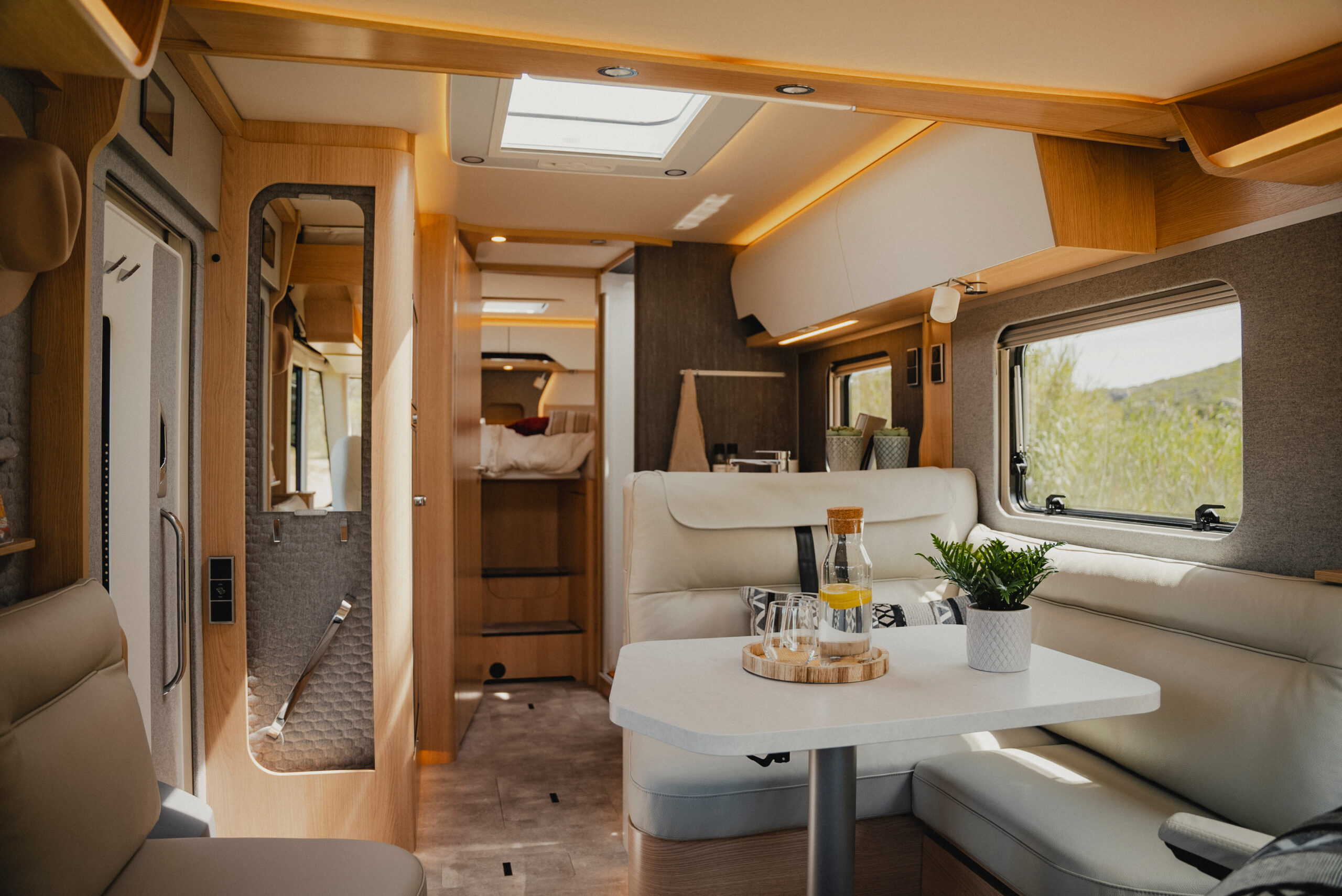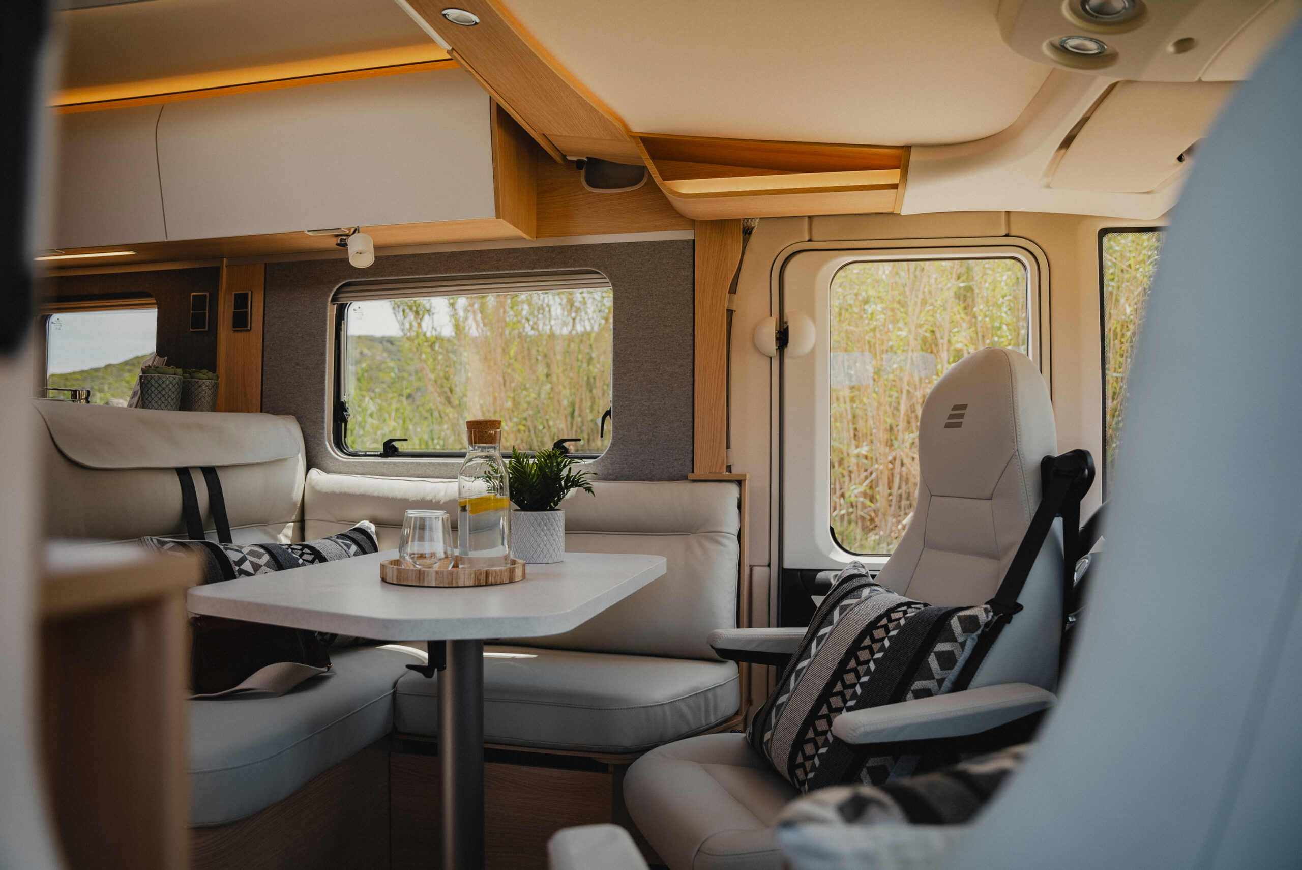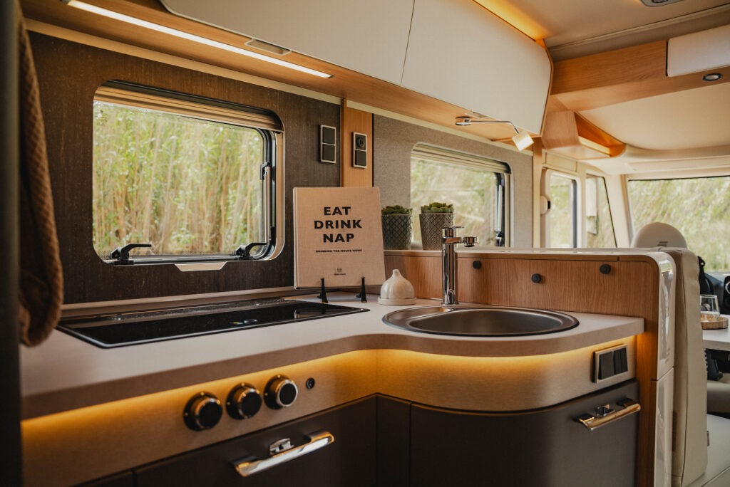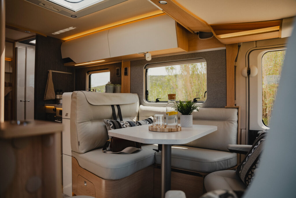 Wnętrze BlackLine zachwyca nowoczesną atmosferą. Wyrafinowana podłoga w wykończeniu betonowym komponuje się z ciepłym dekorem Grand Oak, tworząc miejski nastrój przekraczający standardy klasycznych kamperów.
