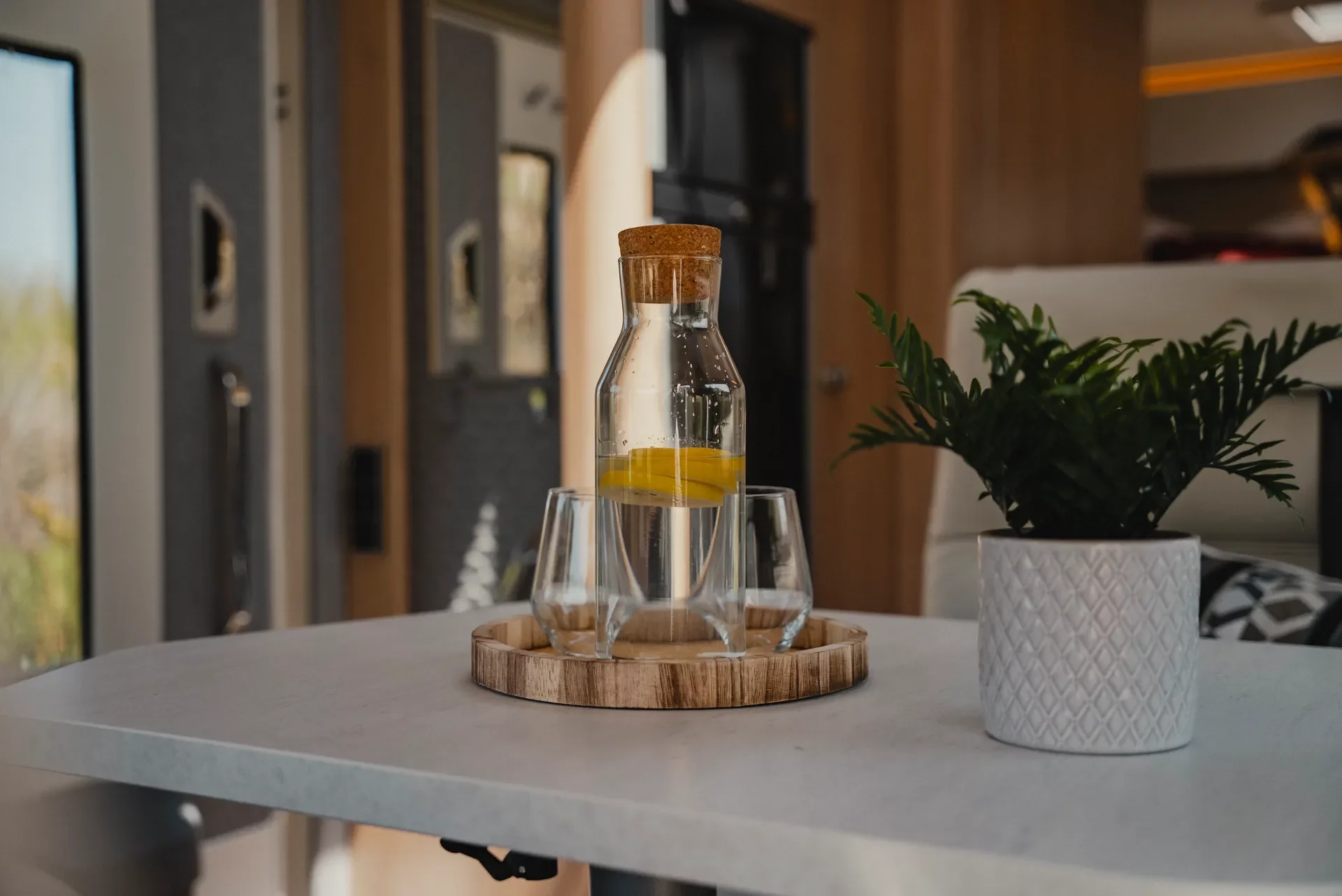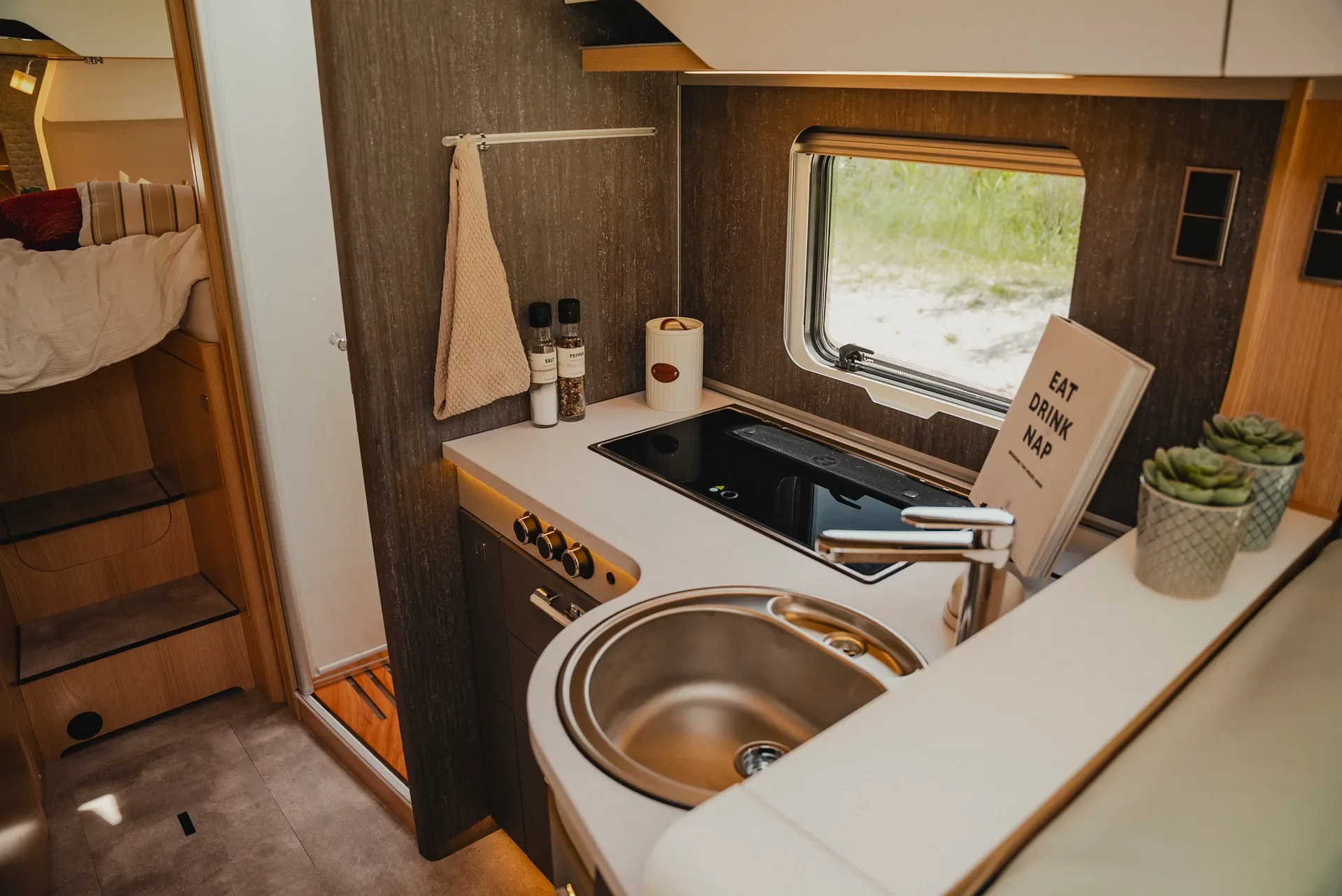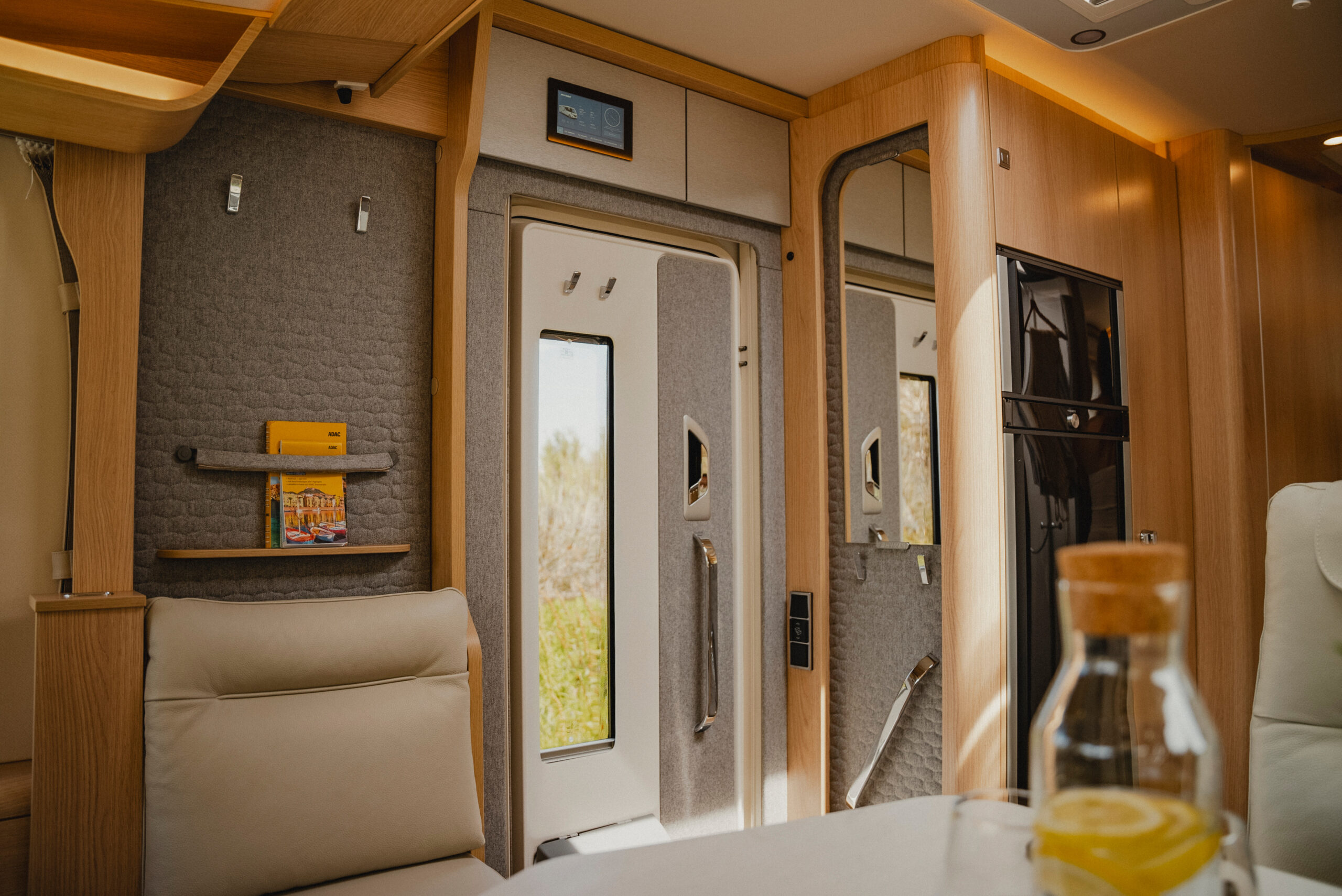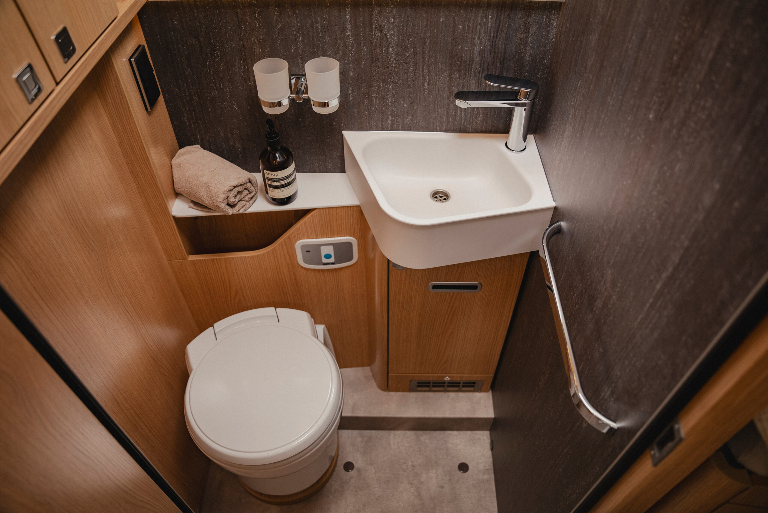 Wnętrze BlackLine zachwyca nowoczesną atmosferą. Wyrafinowana podłoga w wykończeniu betonowym komponuje się z ciepłym dekorem Grand Oak, tworząc miejski nastrój przekraczający standardy klasycznych kamperów.