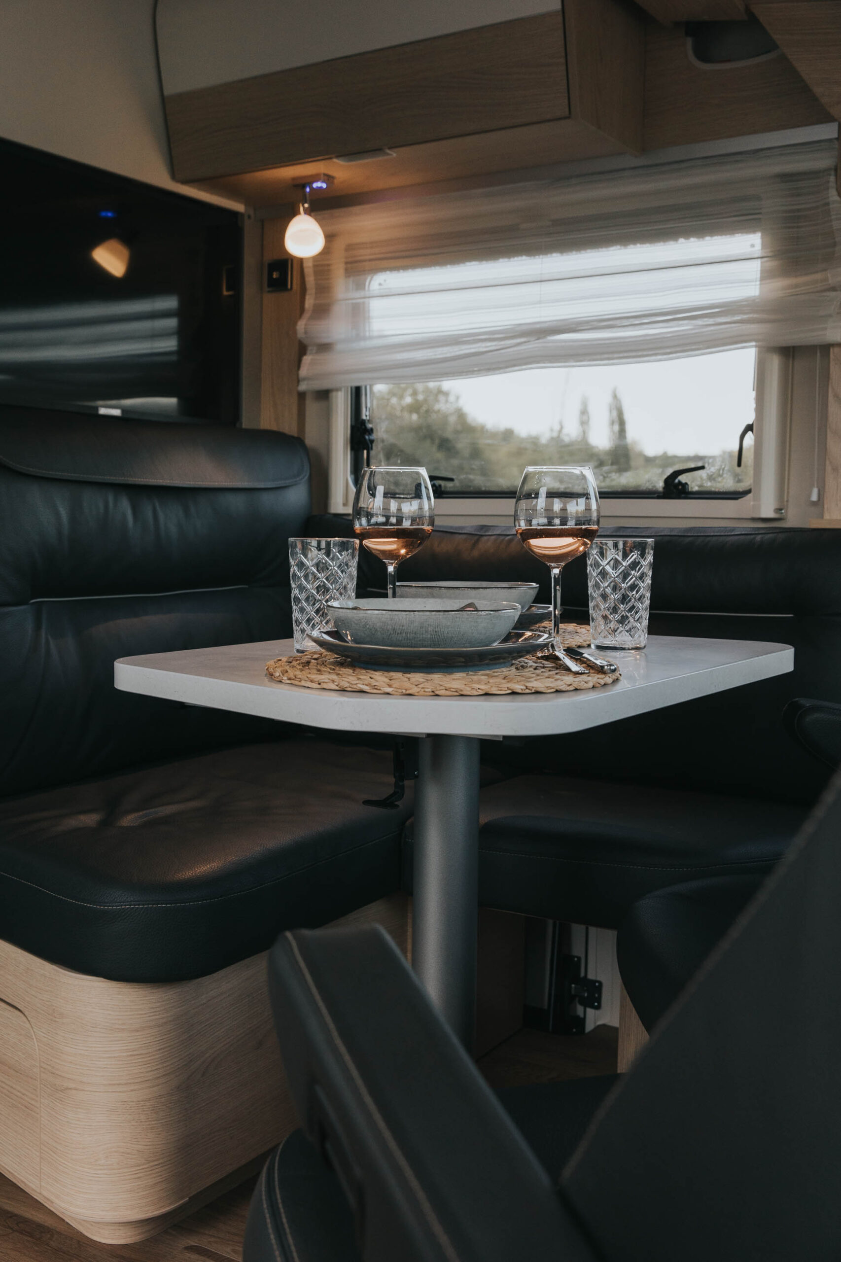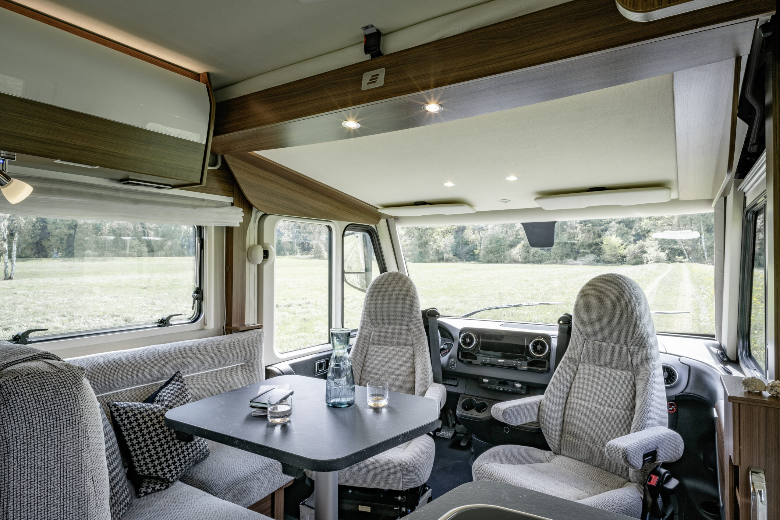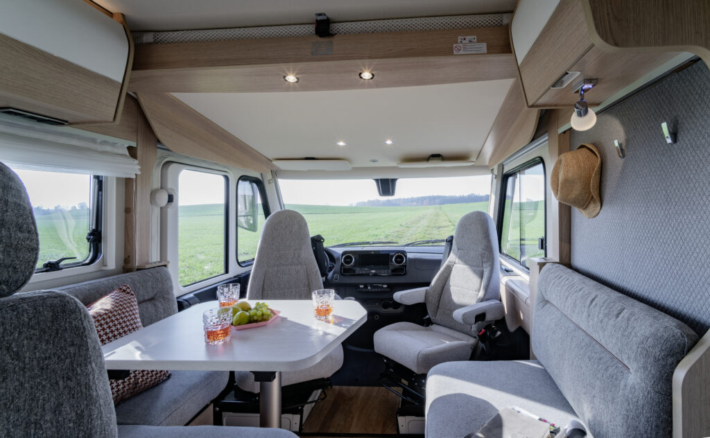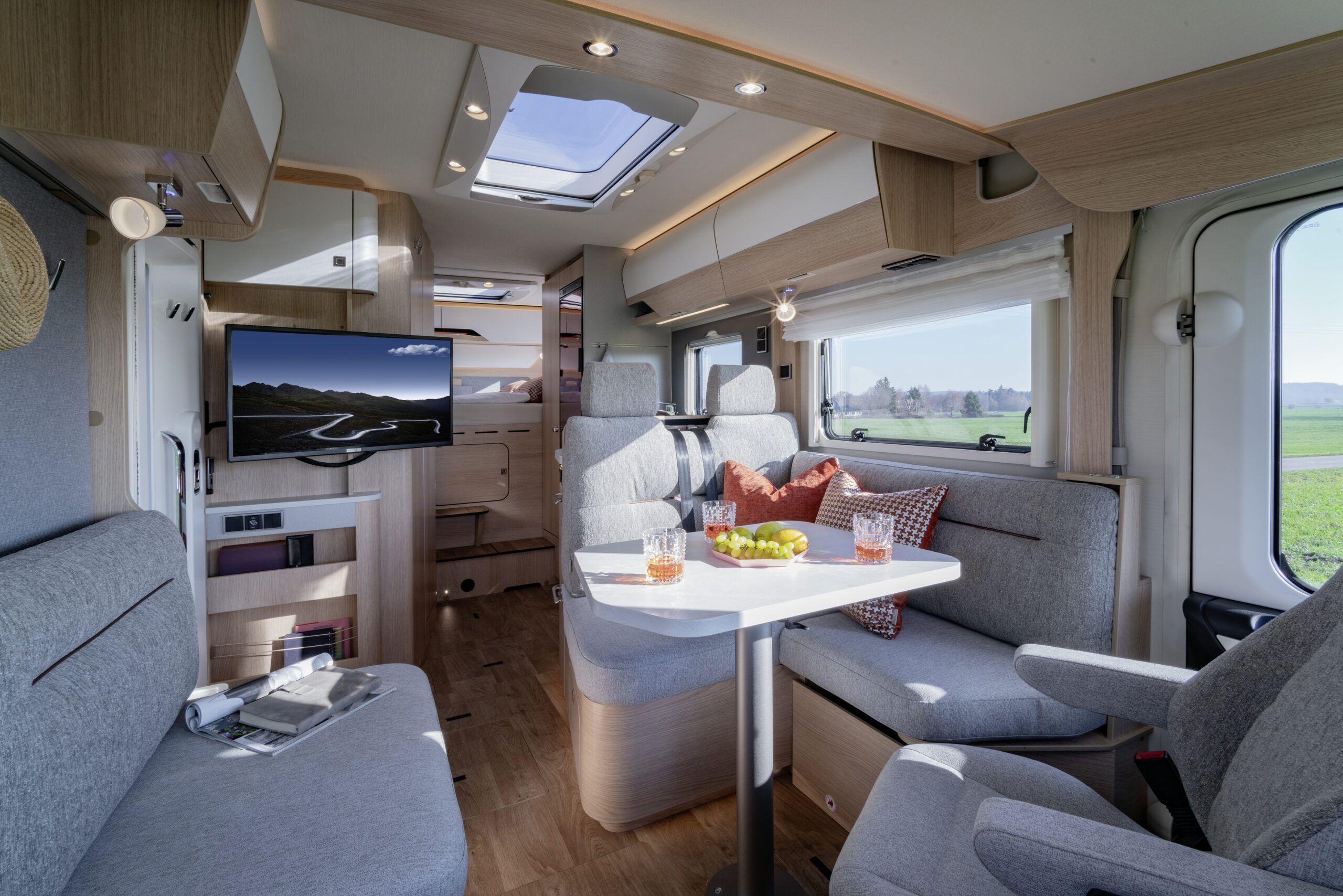 Podwójnie oszklony świetlik panoramiczny 80 x 50 cm z oświetleniem LED w salonie gwarantuje doskonałe doświetlenie wnętrza oraz widoki podczas podróży