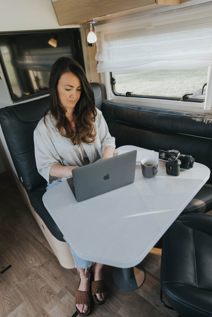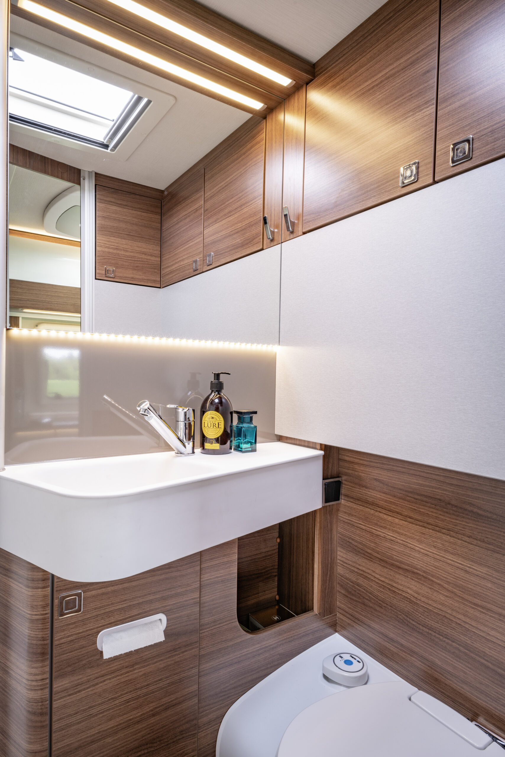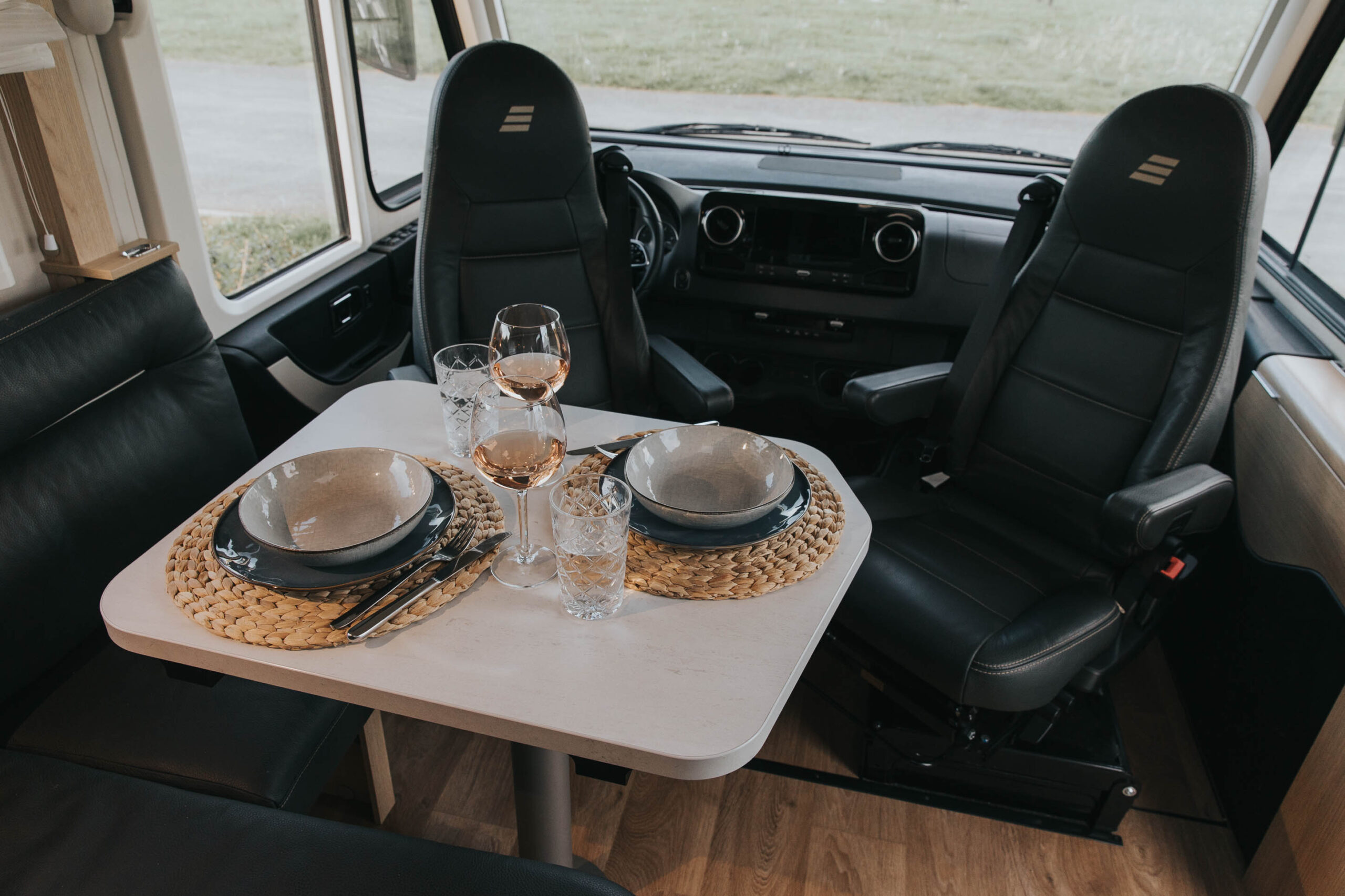 Podwójnie oszklony świetlik panoramiczny 80 x 50 cm z oświetleniem LED w salonie gwarantuje doskonałe doświetlenie wnętrza oraz widoki podczas podróży
