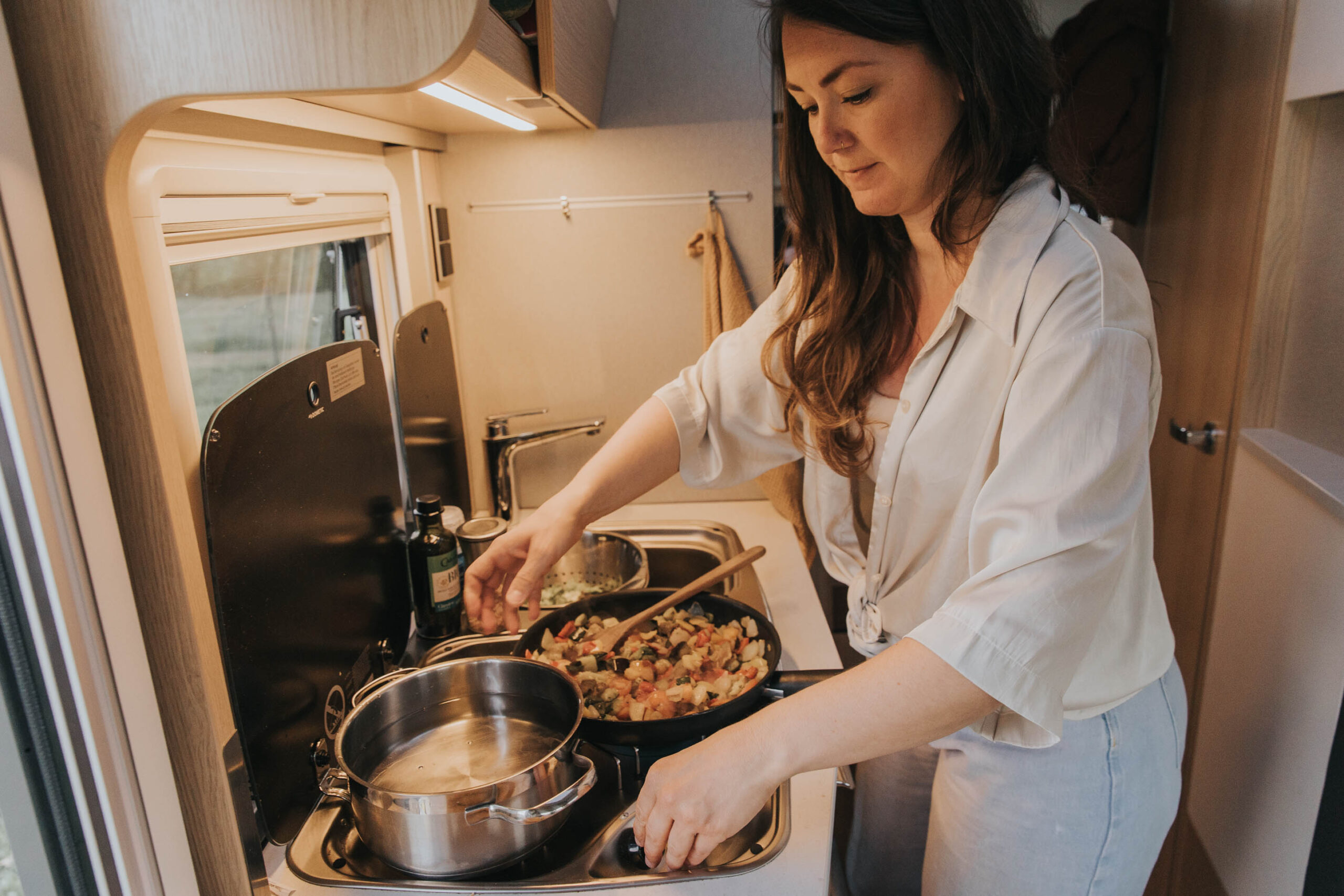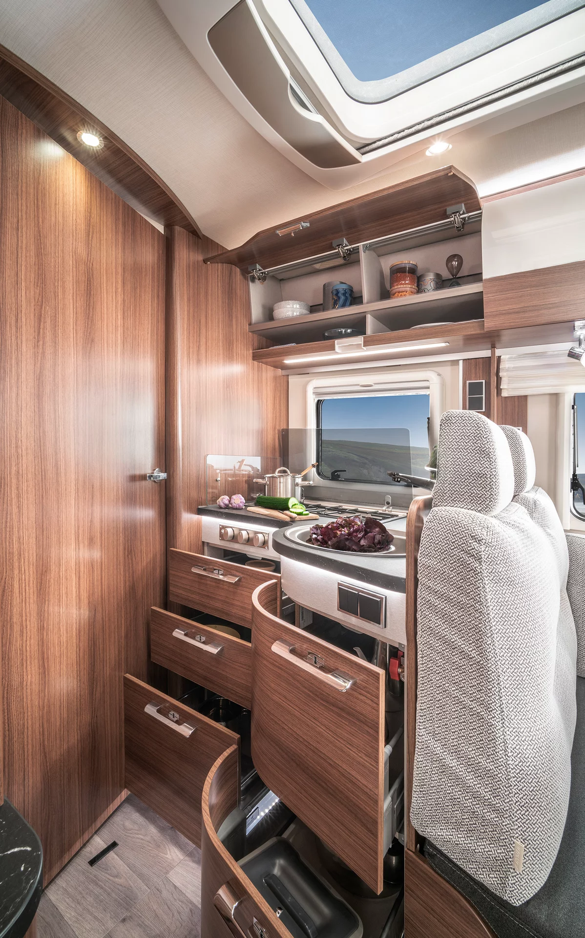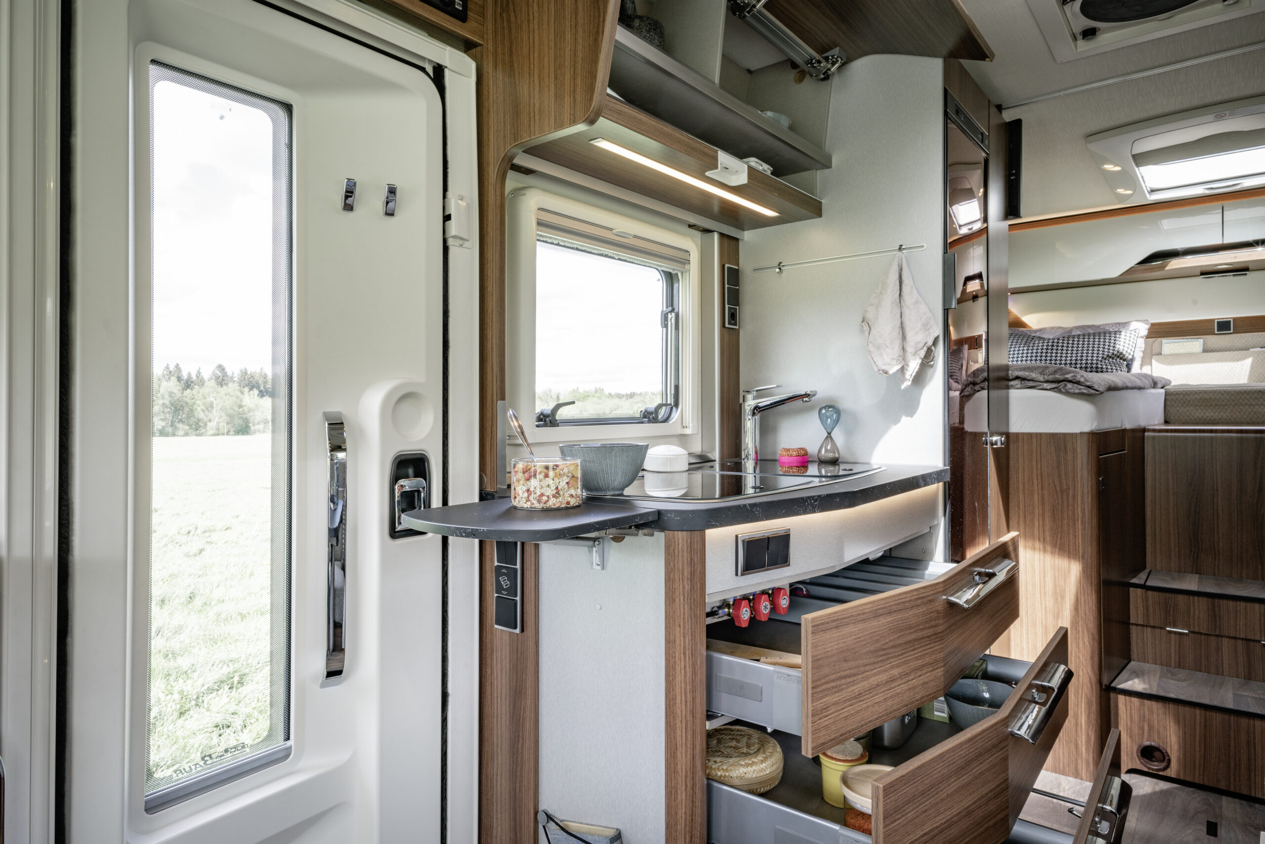Duże drzwi garażowe po obu stronach oraz możliwość załadunku do 350 kg (opcjonalnie do 450 kg*) pozwalają na łatwe przechowywanie sprzętu turystycznego i bagażu.