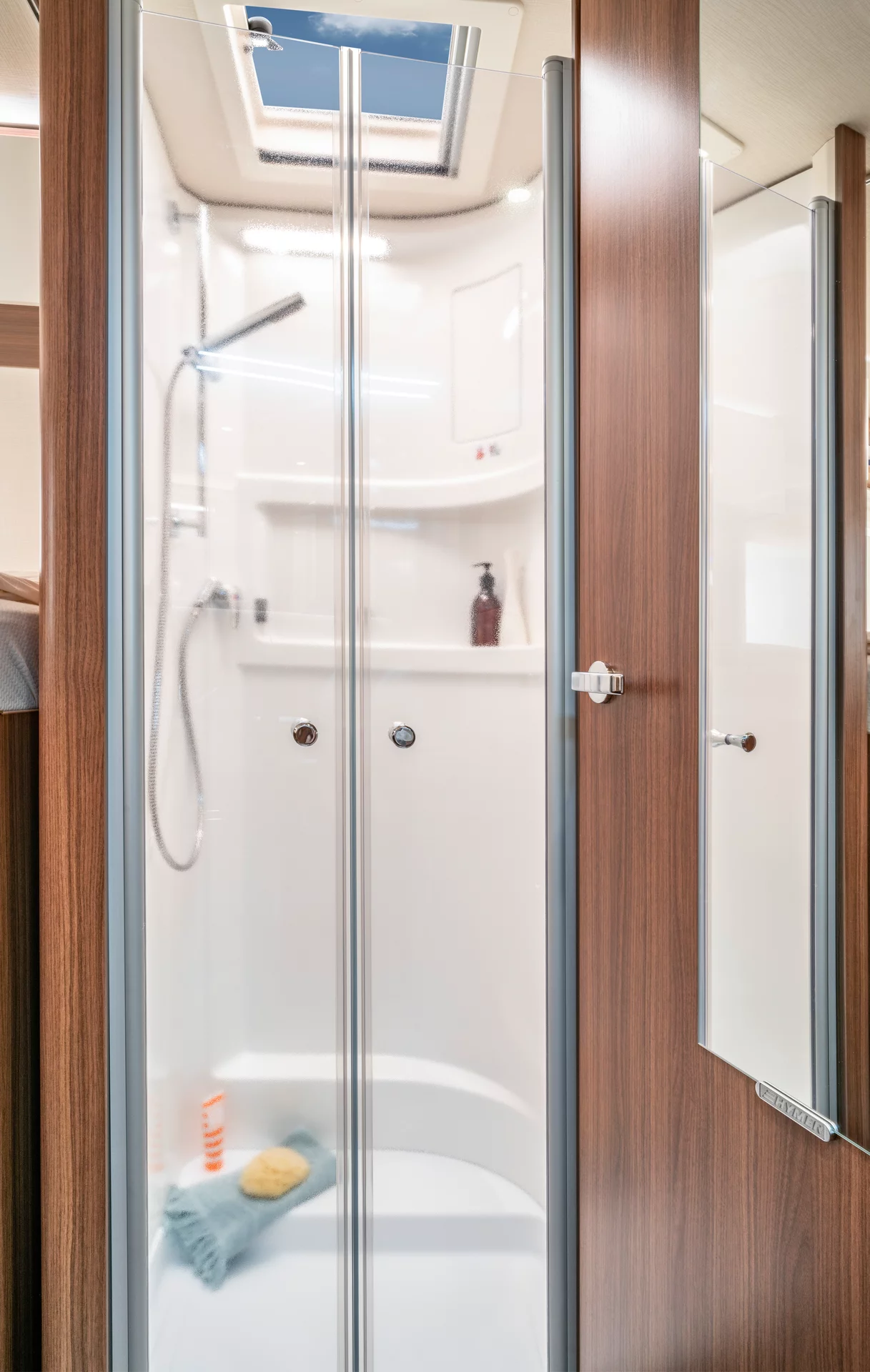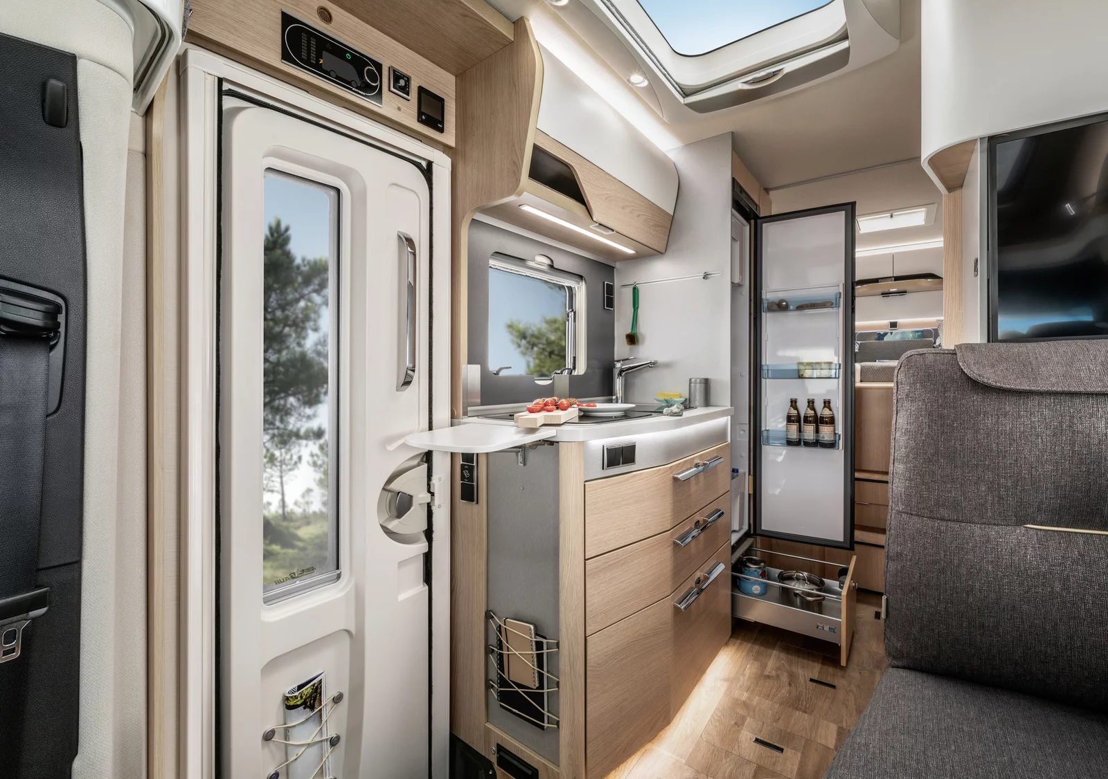 Drzwi Maxi Comfort o szerokości 60 cm z oknem, roletą zaciemniającą i koszem na śmieci zapewniają wygodne wejście do pojazdu oraz funkcjonalność na najwyższym poziomie.