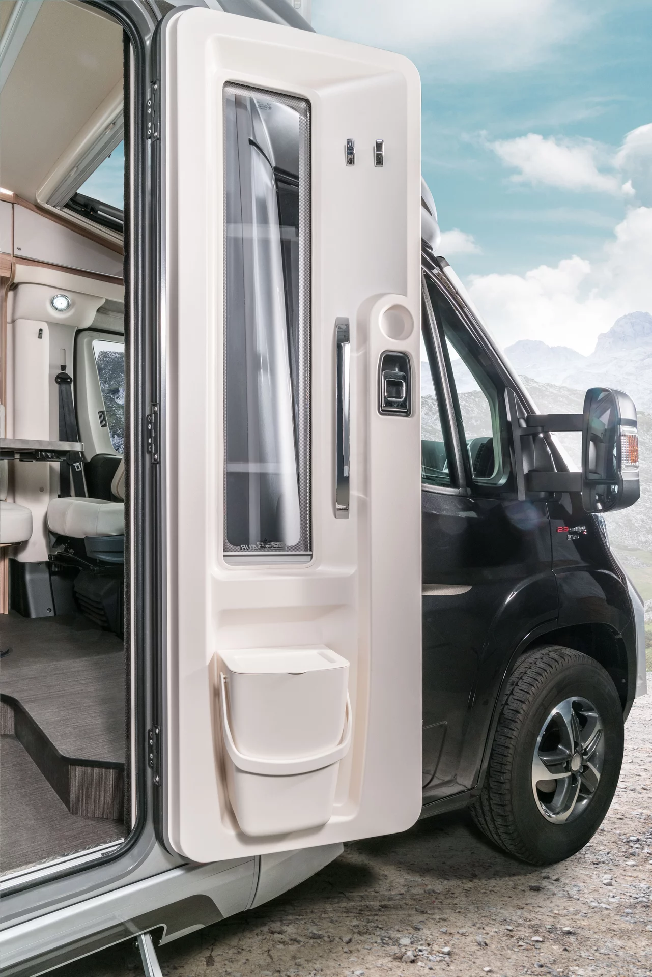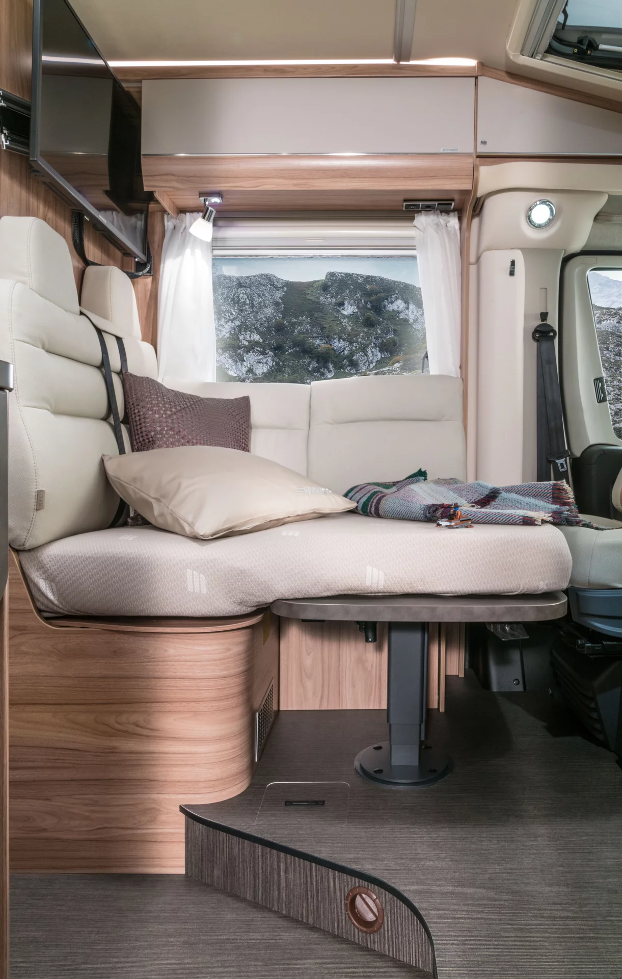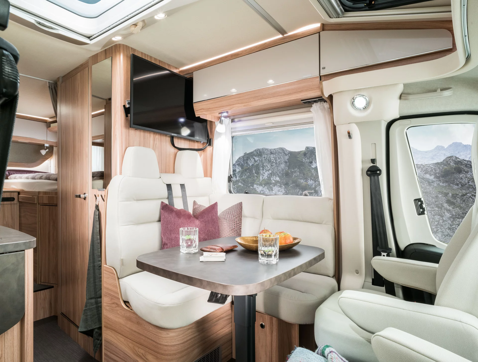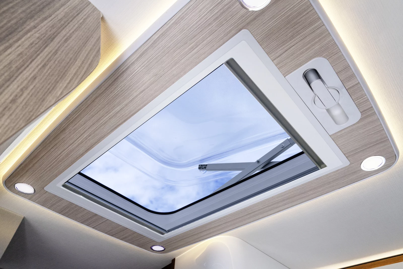 Nowe, panoramiczne okno dachowe Hymer nie tylko wpuszcza mnóstwo światła, ale dzięki niższej konstrukcji zapewnia więcej przestrzeni nad głową. Umożliwia stałą wentylację, nawet podczas deszczu, idealnie komponując się z wnętrzem.