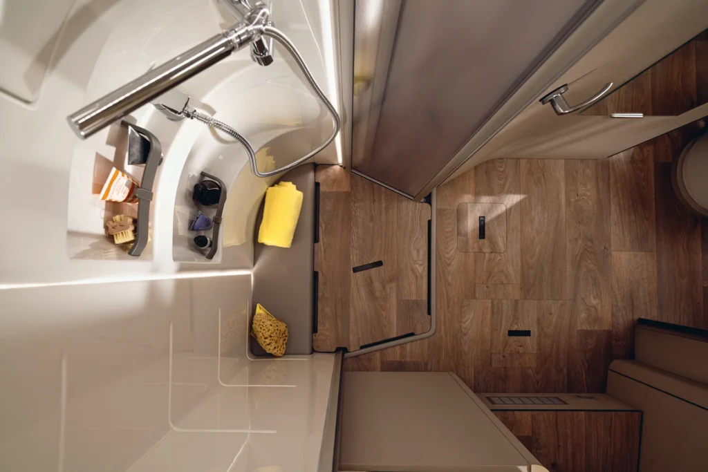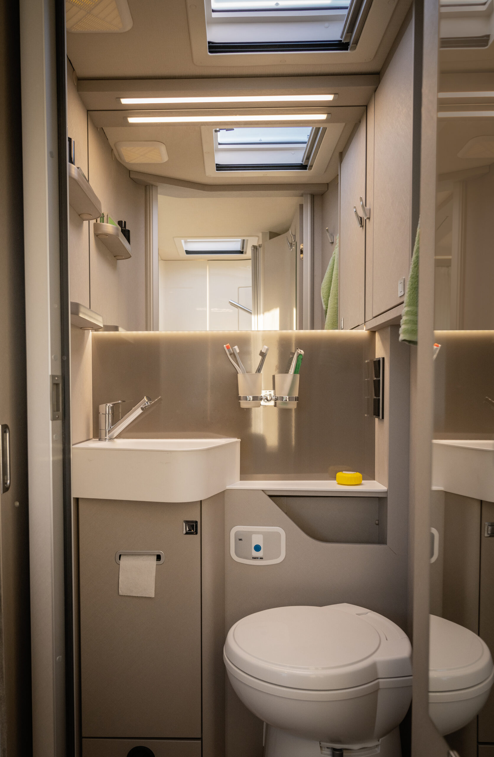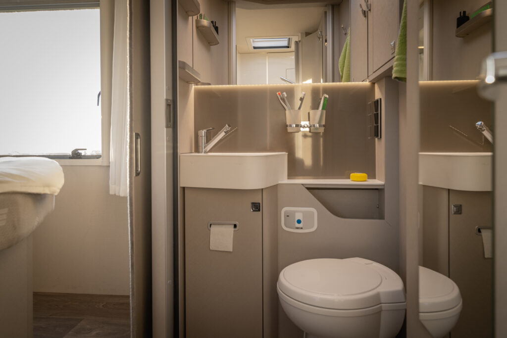 - W łazience en-suite drzwi mogą oddzielać strefę sypialno-łazienkową od reszty kampera, tworząc prywatną przestrzeń.