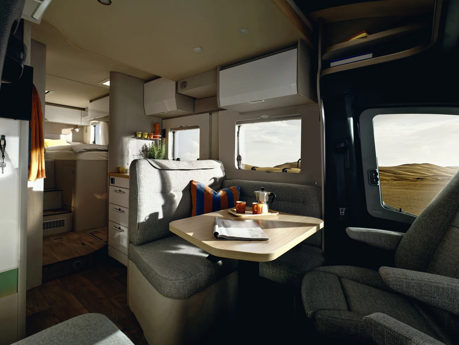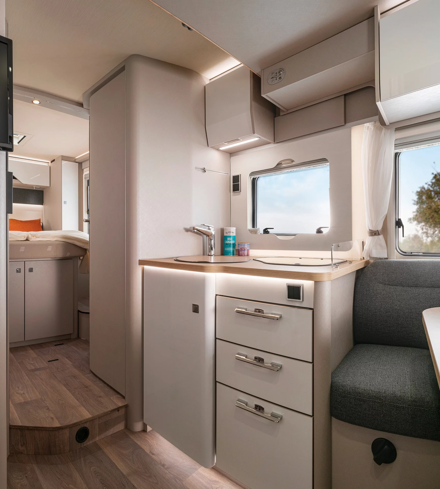 Zapomnij o progach – cała część mieszkalna T-Class S oferuje idealnie równą powierzchnię od kabiny po sypialnię. Ciesz się imponującą wysokością wnętrza 2,04 m i pełną swobodą poruszania się bez ryzyka potknięcia.