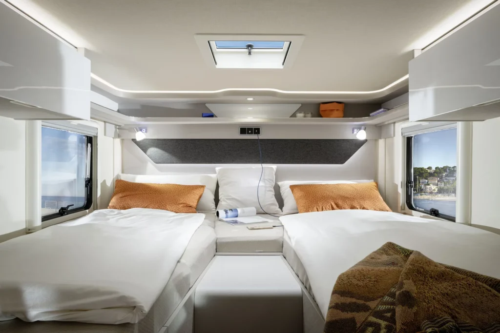 - Płaska podłoga na całej długości (wysokość 2,04 m) i obrotowe fotele kapitańskie tworzą przestronny, zintegrowany salon.
