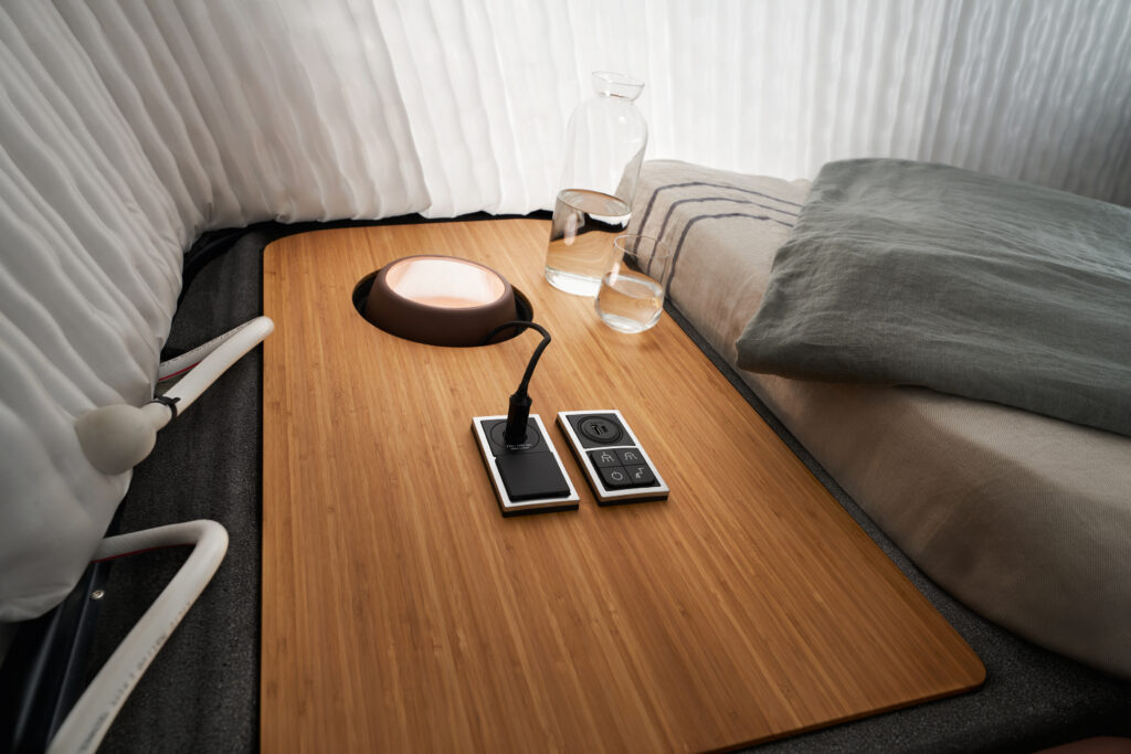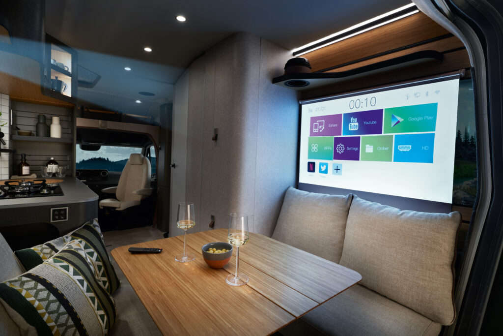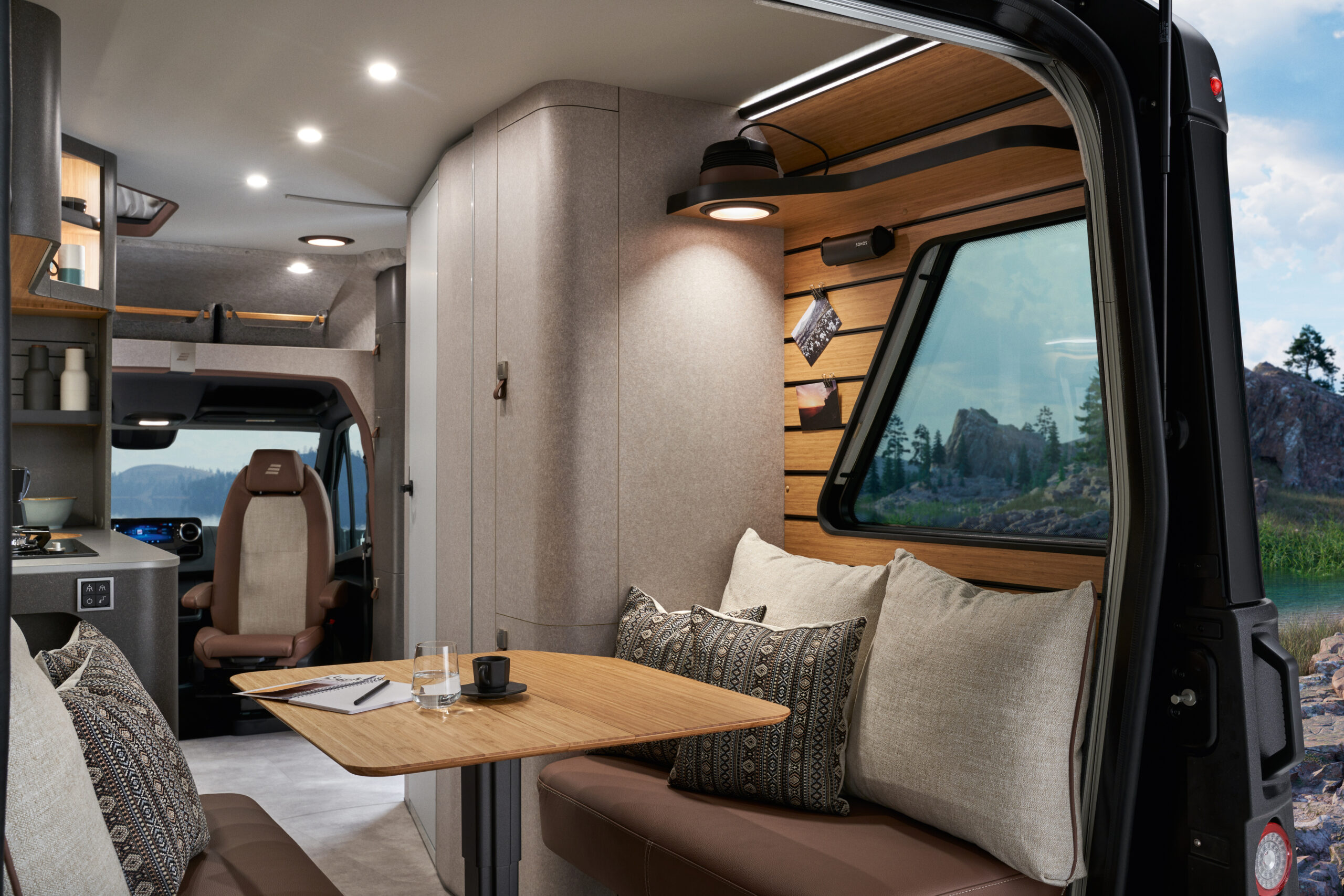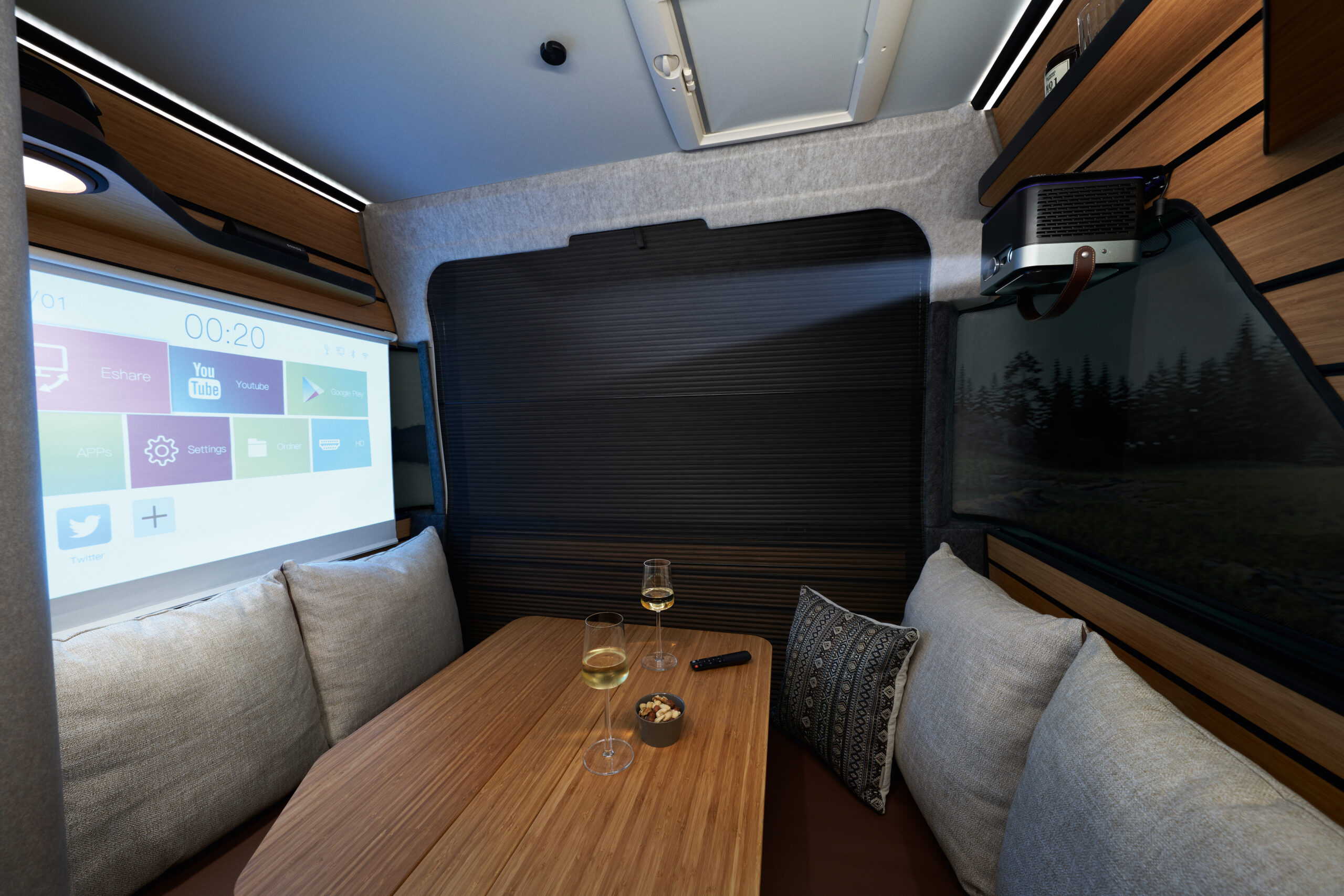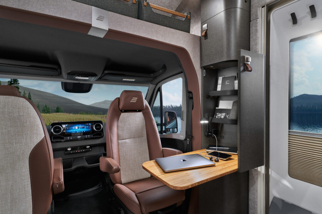 • Zintegrowane biuro domowe z biurkiem wbudowanym w ścianę boczną za fotelem pasażera, idealne do pracy zdalnej pod elastycznym świetlikiem dachowym