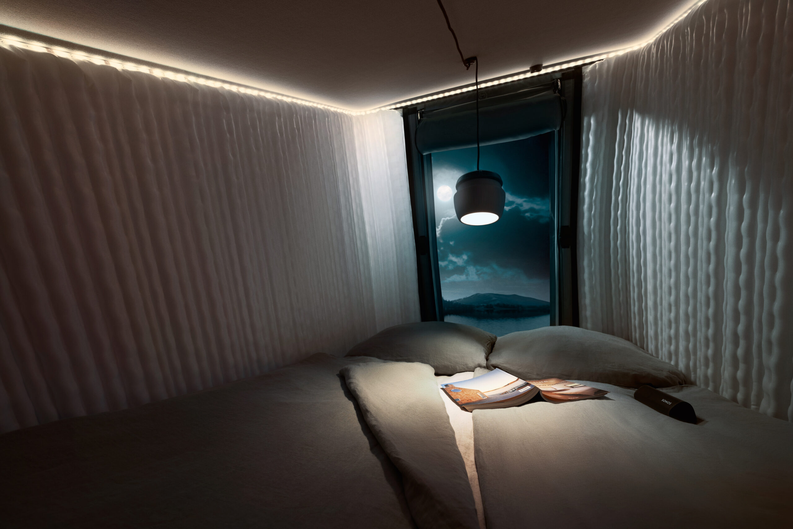 Wytrzymałe ściany zewnętrzne zapewniające izolację przed ciepłem, zimnem, światłem i hałasem, kryjące przestronną sypialnię z regulowanym materacem i panoramicznym oknem