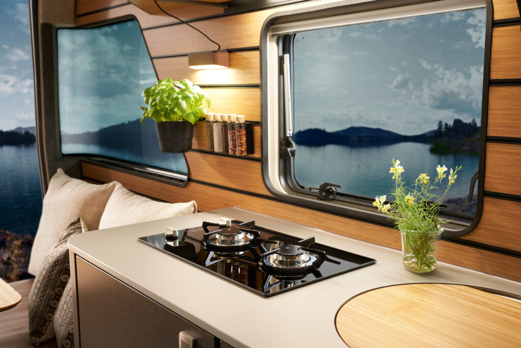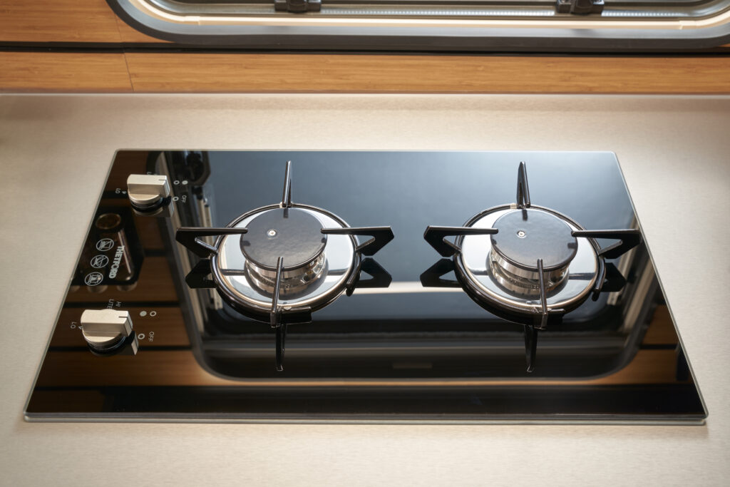 • Nowoczesna, w pełni wyposażona kuchenka z dwupalnikową kuchenką gazową i eleganckim, matowo-czarnym wykończeniem