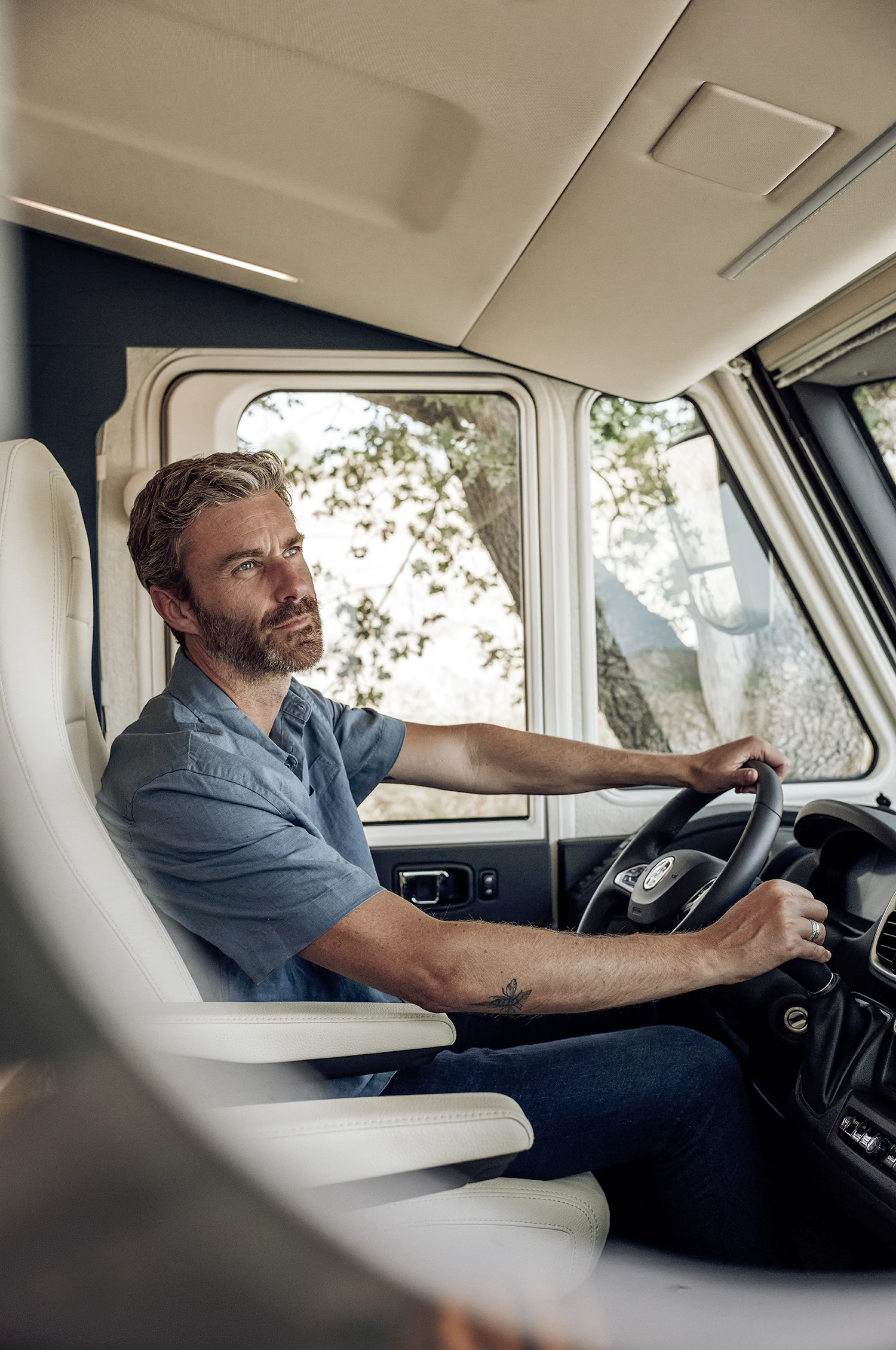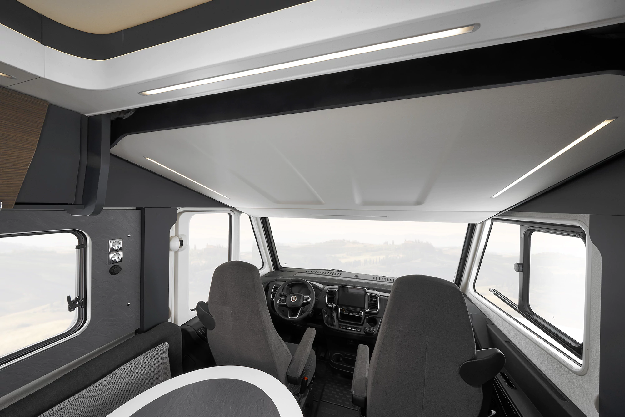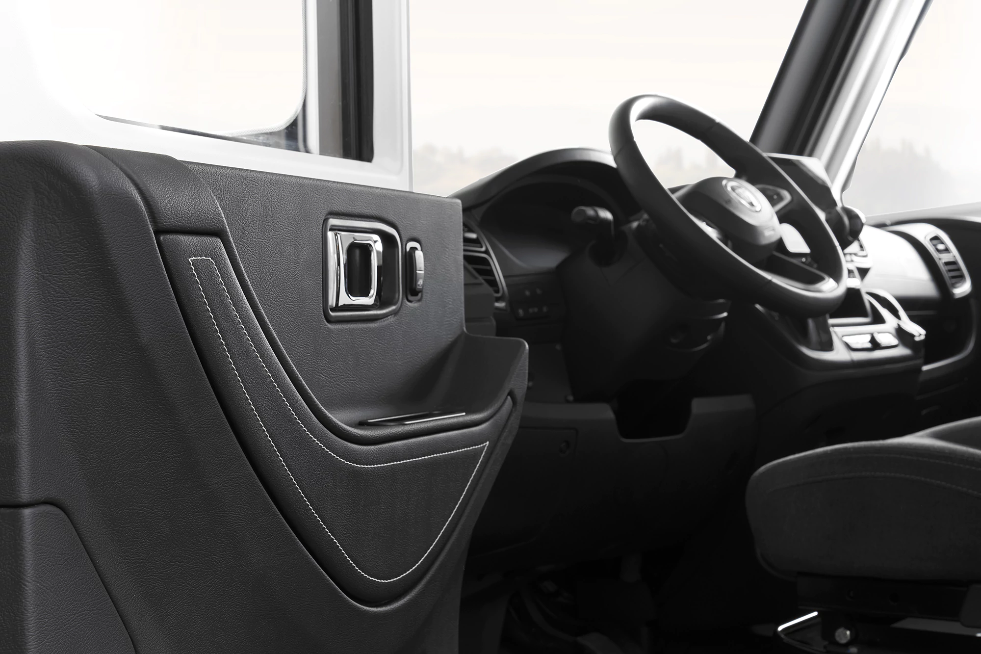 - unowocześniony design szoferki – detale z ekoskóry, z efektownymi przeszyciami na desce rozdzielczej i drzwiach kierowcy, funkcjonalne szafki boczne