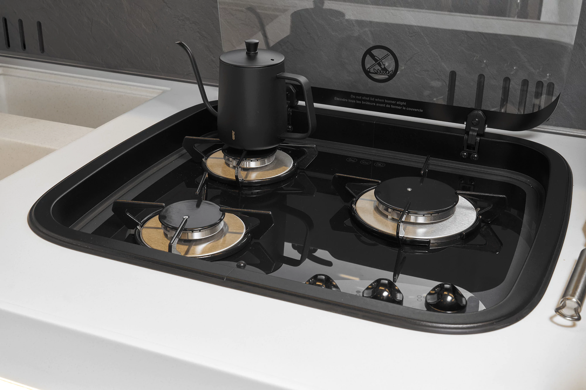 - przestronna strefa kuchenna z 3-palnikową kuchenką i lodówką 153 l
