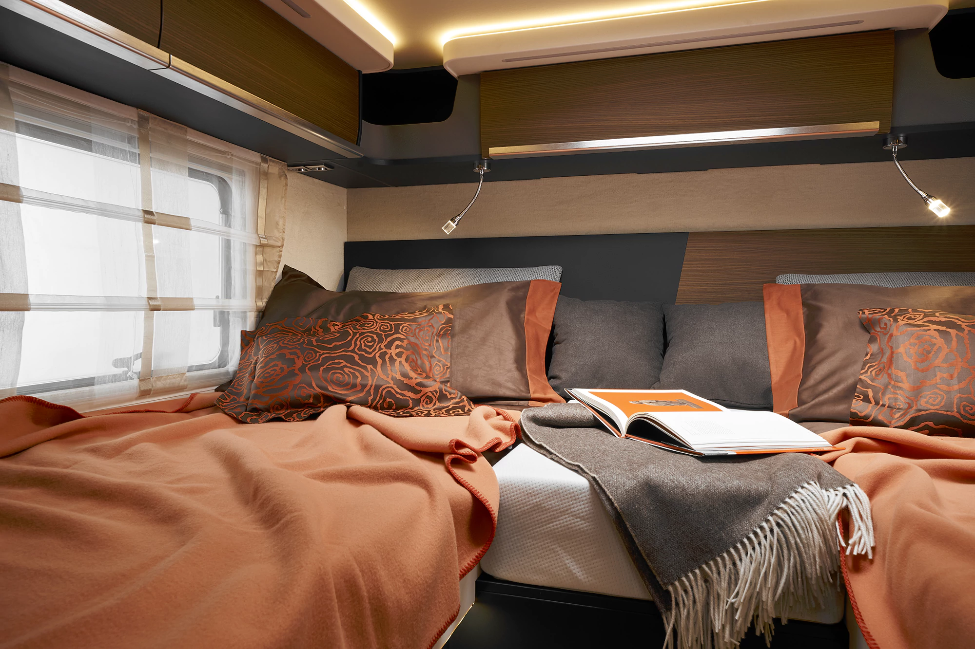 - opuszczane łóżko elektryczne nad kabiną kierowcy o wym. 195×140 cm, wyposażone w komfortowy materac piankowy