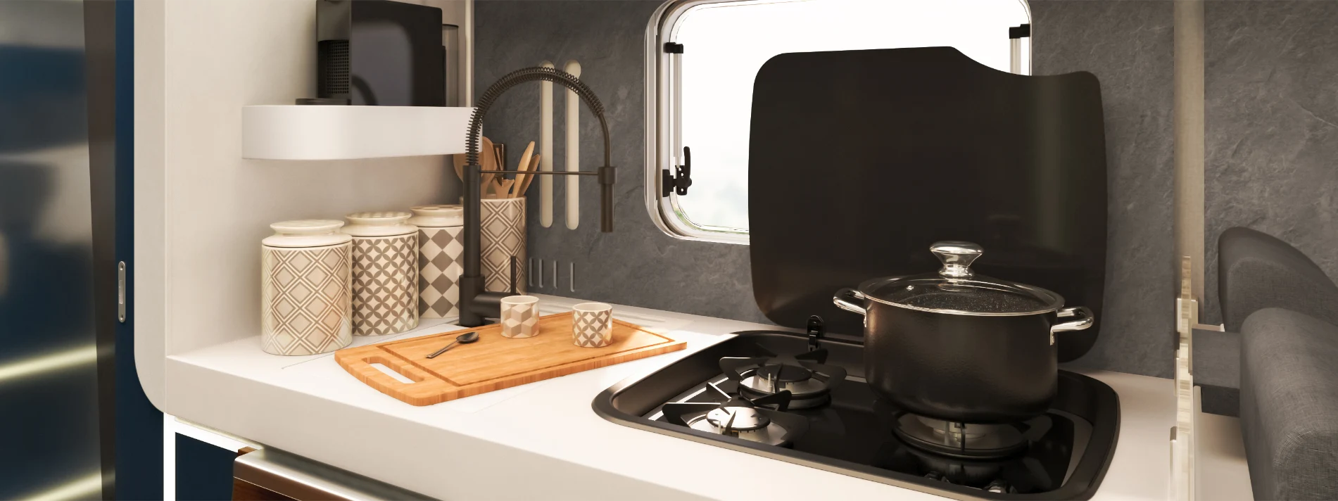 • innowacyjna część kuchenna z podwójną umywalką, piekarnikiem gazowym i pojemną lodówką